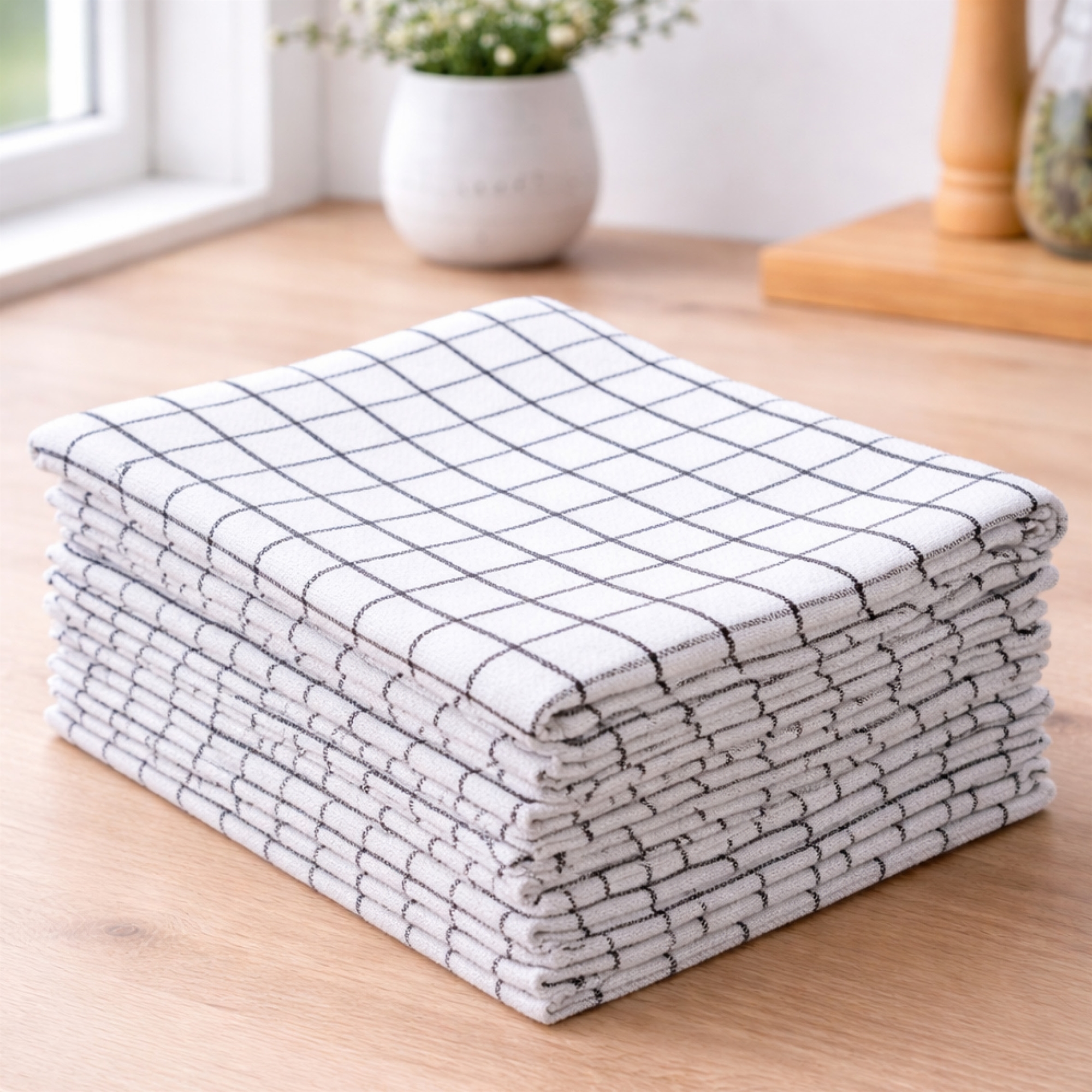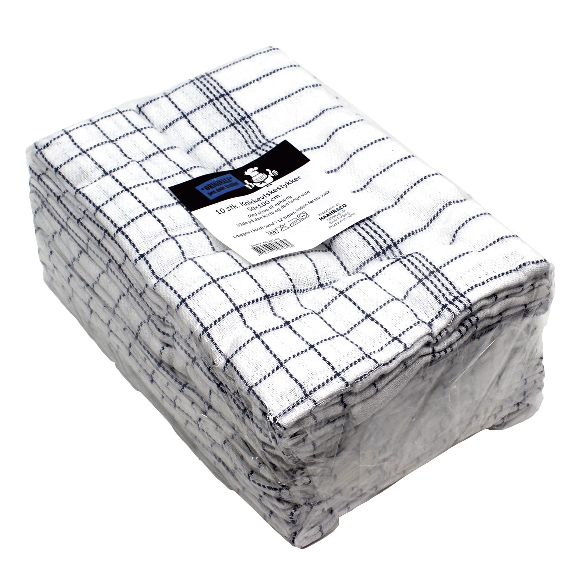 Dessa vita kökshanddukar i 10-pack är klassiska kockhanddukar med svarta rutor som ger ett tidlöst och professionellt uttryck i köket. Den enkla designen passar perfekt både i hemmet och i det professionella köket.