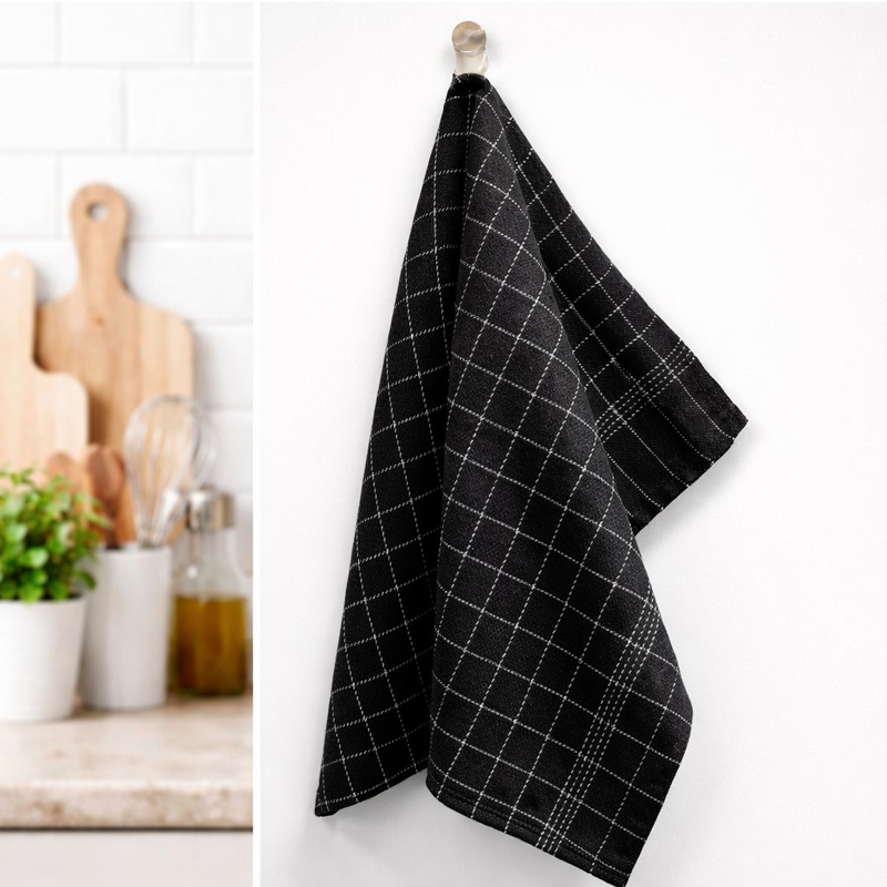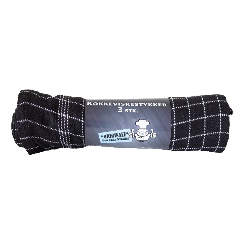 Dessa svarta kökshanddukar i 3-pack är kända och klassiska kockhanddukar med vita, rutiga detaljer. Den tidlösa designen kombinerad med den moderna svarta färgen ger både ett stilrent uttryck och funktionalitet som passar in i de flesta kök. Handdukarna är tillverkade i 100% bomull, vilket garanterar hög uppsugningsförmåga och effektiv torkning av porslin, händer och köksytor. Med måtten 50 x 70 cm har handdukarna en praktisk storlek som gör dem väl lämpade för dagligt bruk, både i hemmet eller i det professionella köket. Obs! Lägg handdukarna i kallt vatten i 12 timmar innan första tvätten (ökar uppsugningsförmågan, binder färgerna och minskar ludd och krympning).