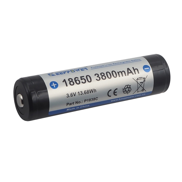 Keeppower 18650 3,6 volt uppladdningsbart litiumjonbatteri med en kapacitet på 3800 mAh. Keeppower-batteriet är utrustad med Panasonic-celler. Ersätter batterier i belysning och fotoutrustning, kan laddas och därmed spara mycket pengar jämfört med att byta ut engångsbatterier. Kan användas till e-cigaretter. Inbyggda skyddskretsar.