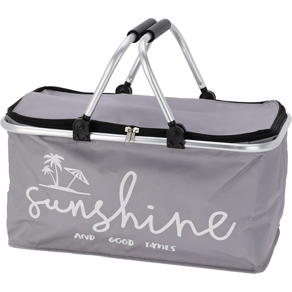 Denna praktiska kylväska är tillverkad i slitstark 600D polyester, vilket säkerställer hög hållbarhet och lång livslängd. Det isolerade inre håller effektivt innehållet kallt i flera timmar och gör kylväskan idealisk för picknick, strandutflykter, camping och inköp. Ramen och handtagen är designade i aluminium, vilket ger stabilitet och bra bärkomfort. Kylväskan kan vikas platt när den inte används, vilket gör den lätt att förvara. Kylkorgen är dekorerad med texten “Sunshine and good times”. Dragkedjan säkerställer att kylan bibehålls under transport.
