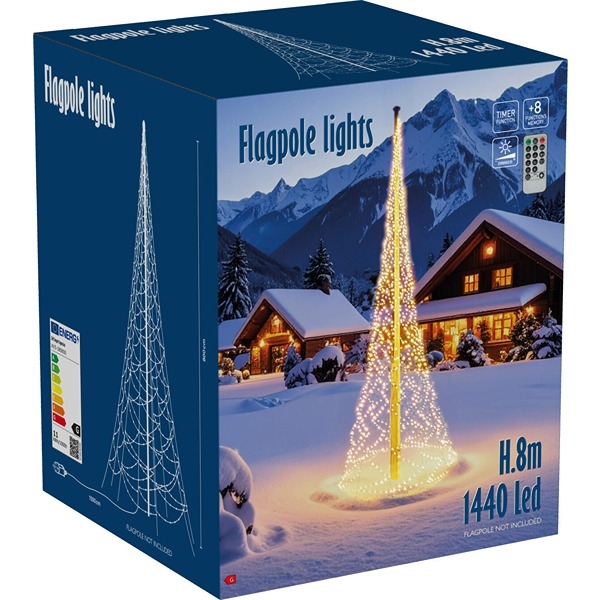 Skapa en strålande lysande julgran eller en vacker ljuskägla i trädgården med denna ljusslinga som hissas upp i flaggstången. Ljusslingan är designad med hela 1440 energibesparande LED-lampor och kan nå 8 meter upp på flaggstången. Den täta ljusfördelningen och det eleganta mönstret skapar ett fylligt, enhetligt uttryck som lyser med mysigt, varmt vitt ljus och ger äkta julstämning. Från ljusslingan till uttaget är det 15 meter kabel, vilket ger goda möjligheter att nå ett eluttag vid huset.
