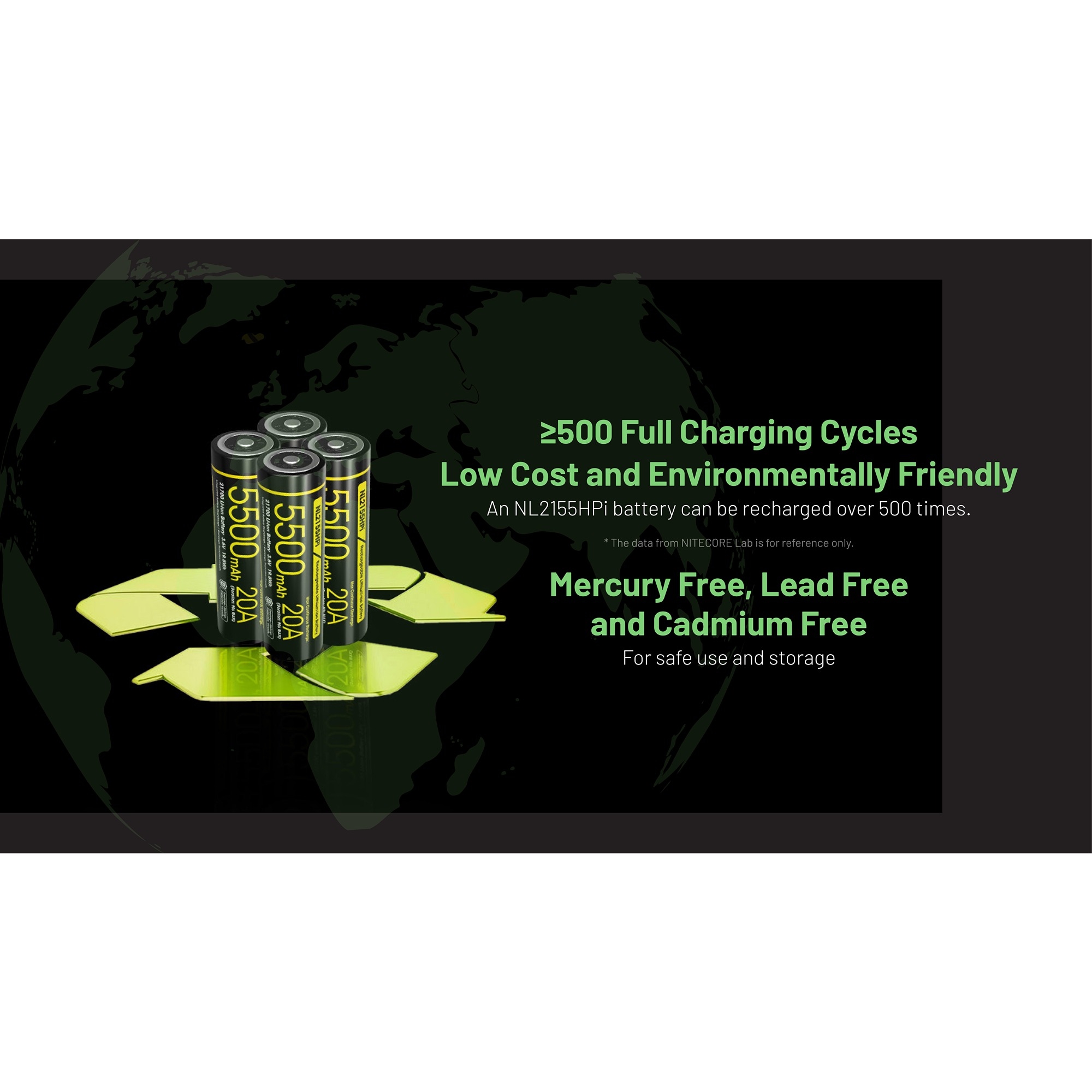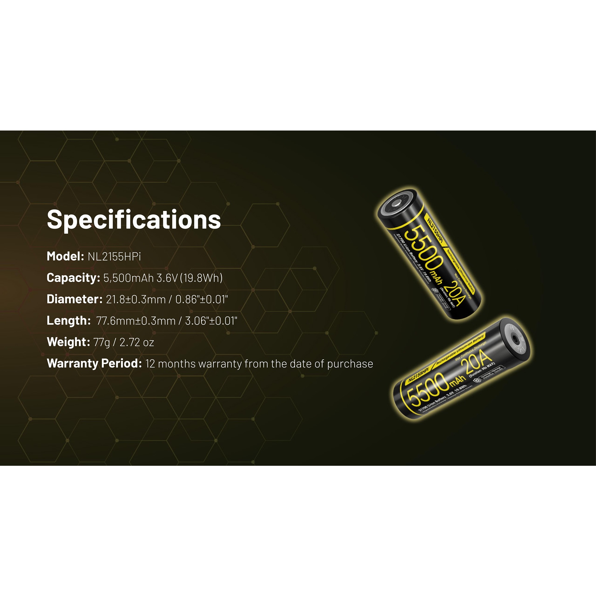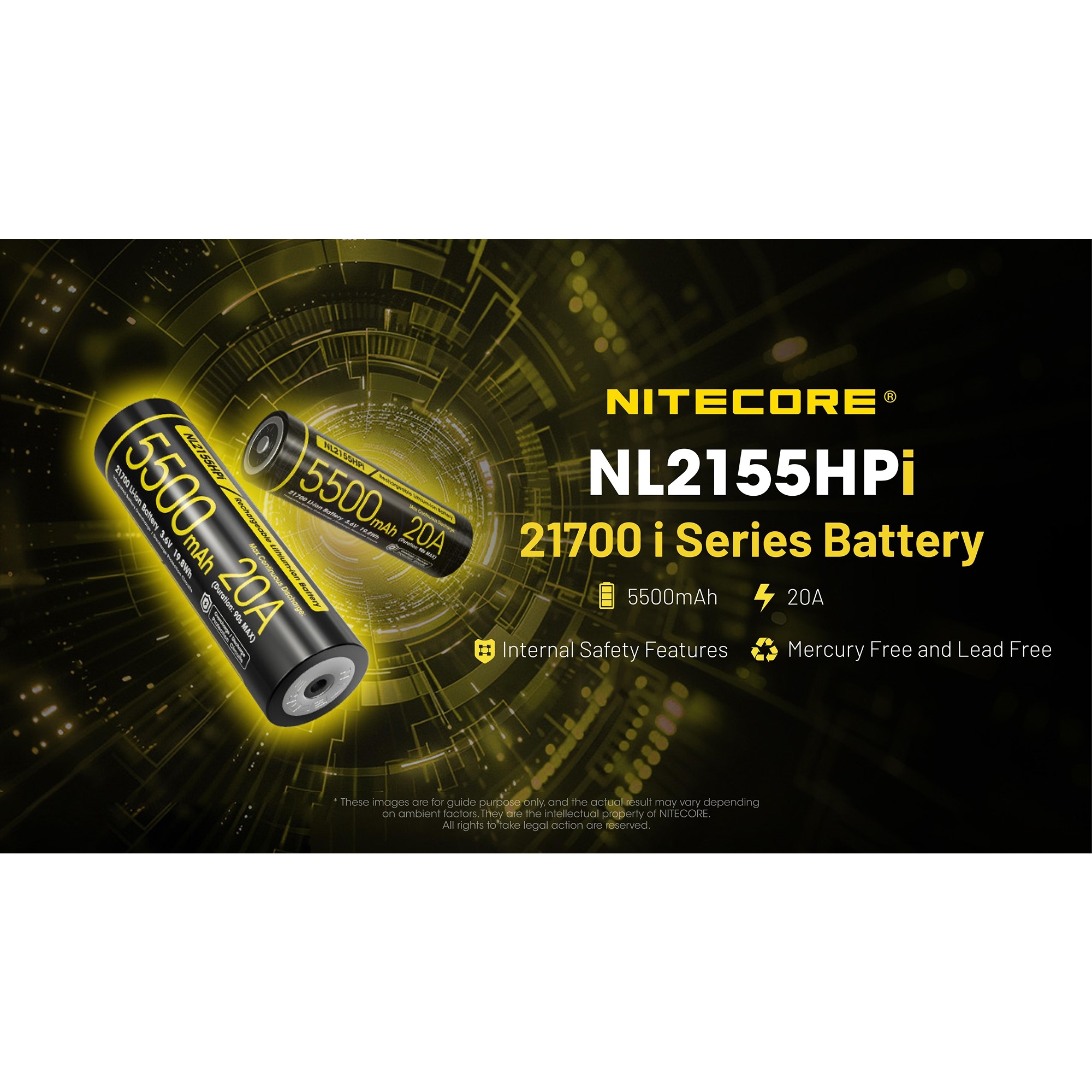 Nitecore NL2155HPi är ett uppladdningsbart li-ion-batteri utvecklat för Nitecores i Series och för användare som behöver stabil ström, hög kapacitet och pålitlig prestanda. Med 5.500 mAh, 3,6 V och en kontinuerlig urladdningsström på 20A är det ett Nitecore-batteri som är skapat för kompatibla ficklampor med högt strömuttag.