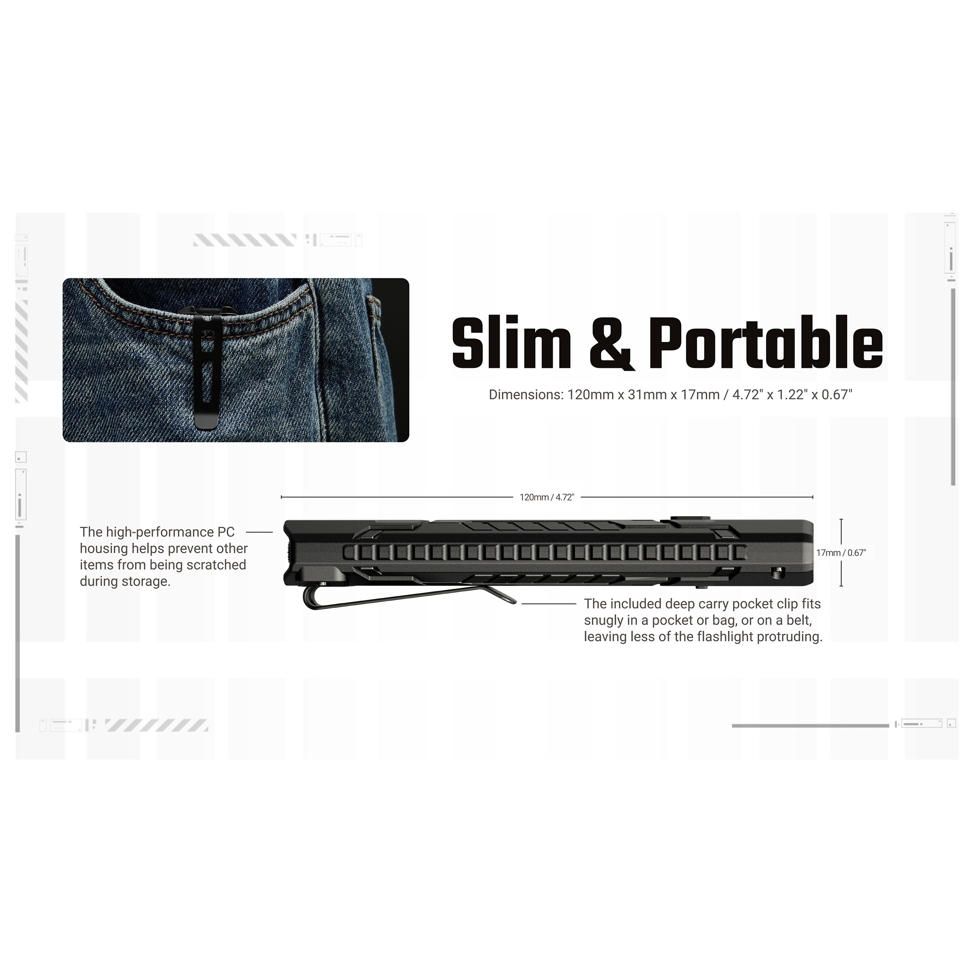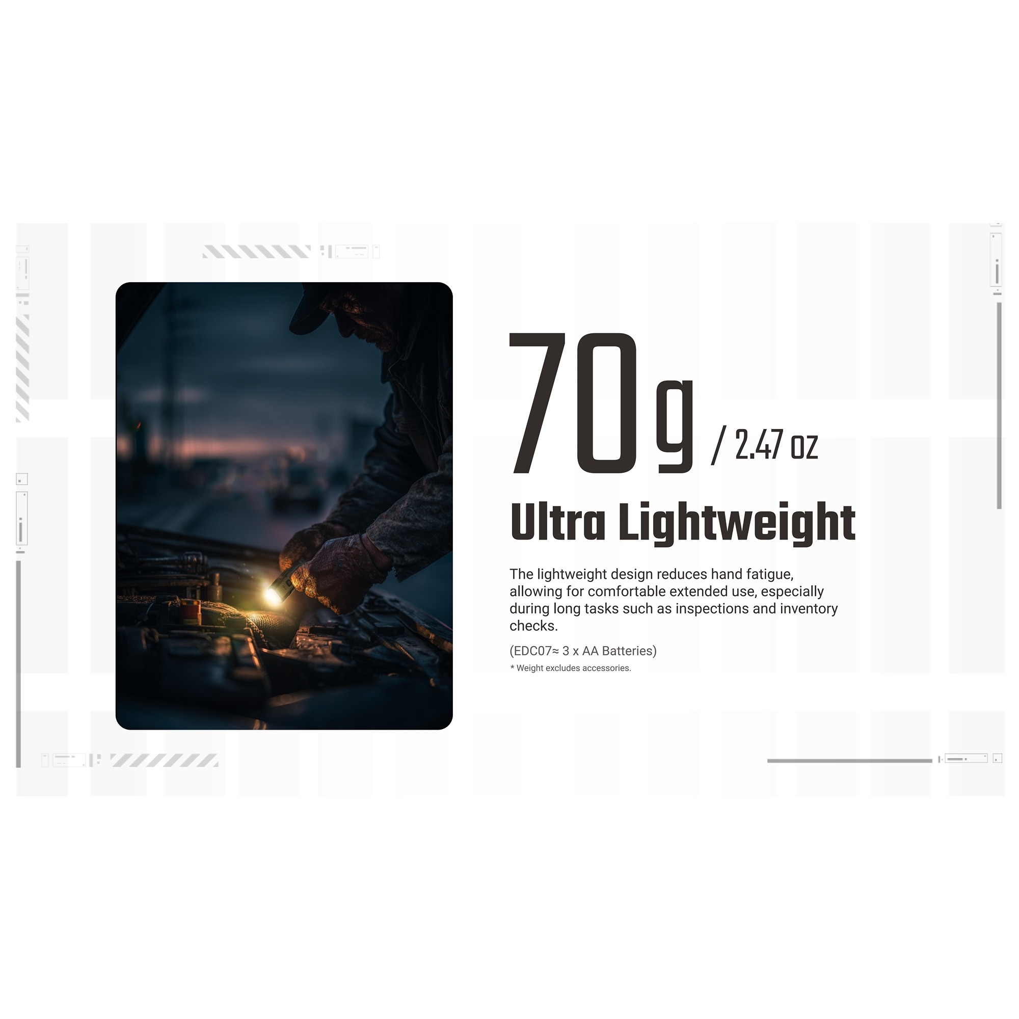 • Mycket lätt konstruktion på 70 g gör den bekväm som EDC-lampa hela dagen.
