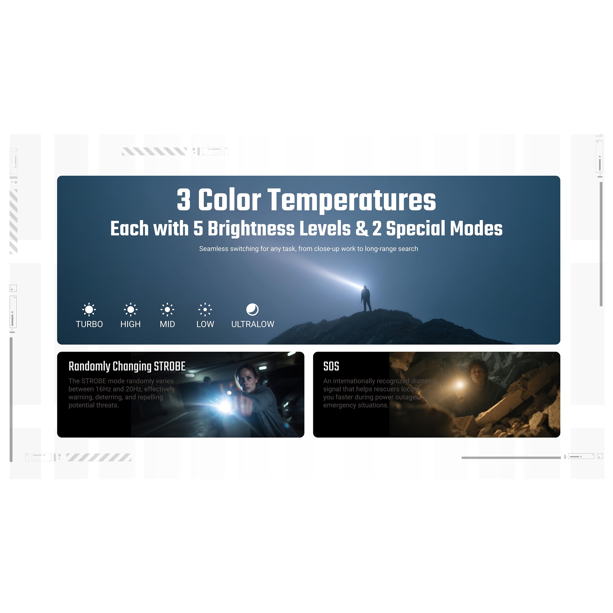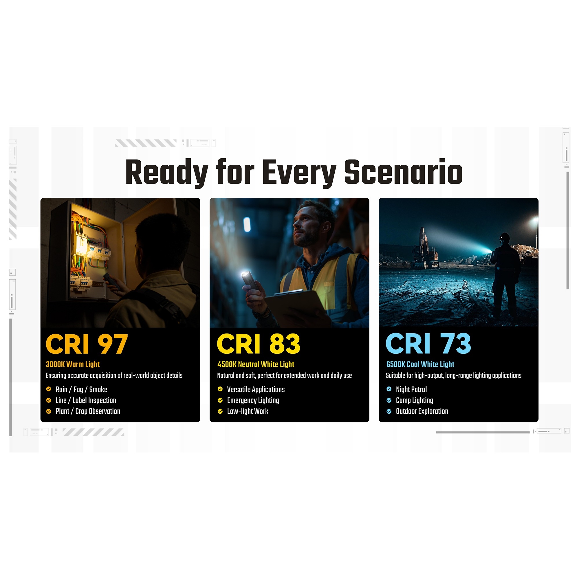 Det som är speciellt med Nitecore EDC07 är ljusets mångsidighet. Lampan har tre färgtemperaturer: varm 3000K, neutral 4500K och kall 6500K. Det innebär att du kan välja ett mer behagligt och detaljrikt ljus för inspektion, läsning och arbete på nära håll eller ett skarpare ljus för utomhusbruk och överblick. Med CRI upp till 97 återger den färger betydligt mer naturligt än många traditionella LED-lampor. Den passar därför för hantverk, tekniskt arbete, lager, bil, camping och som en pålitlig vardagslampa.