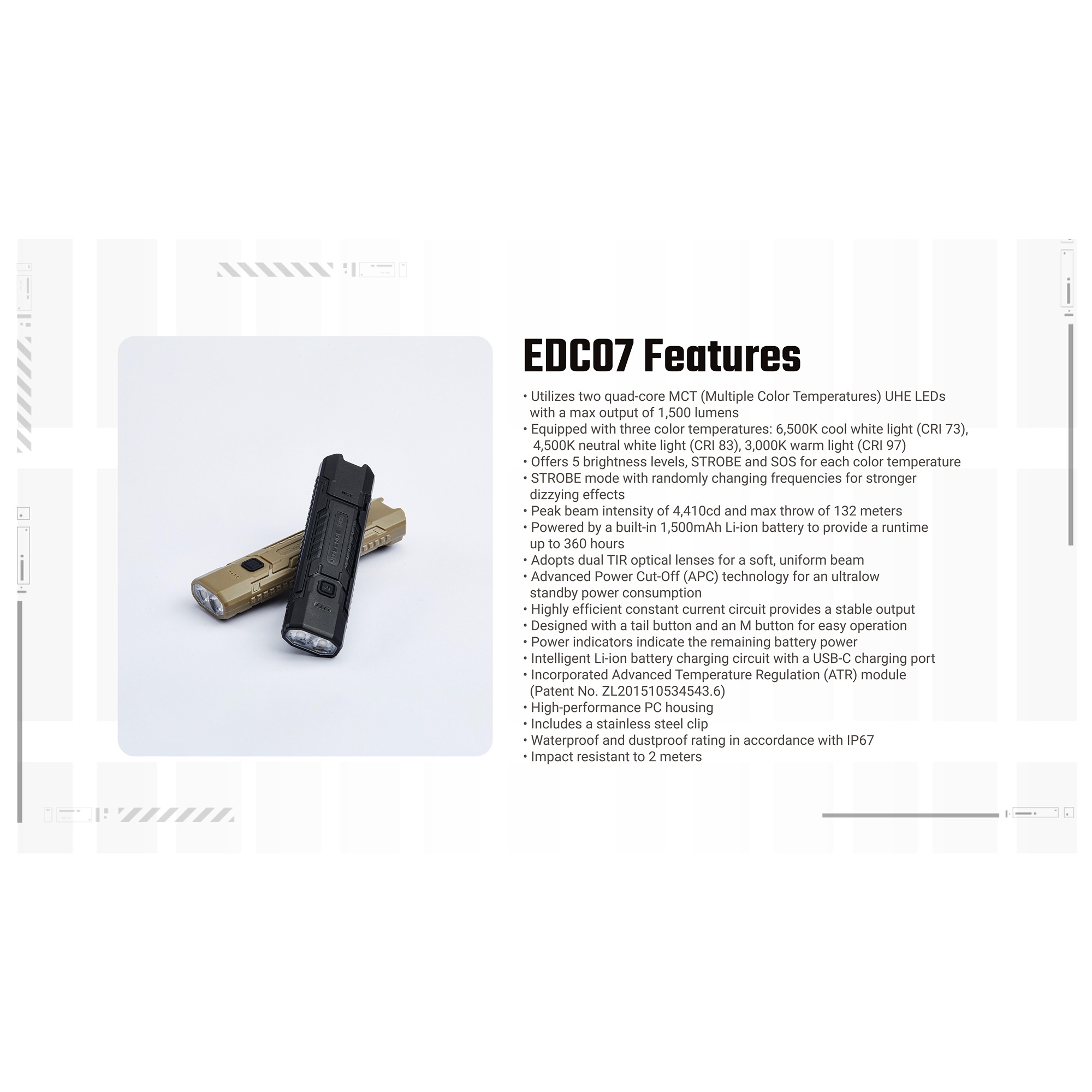Produkt:  Nitecore EDC07 Uppladdningsbar Ficklampa 1500 lumen, Desert Tan