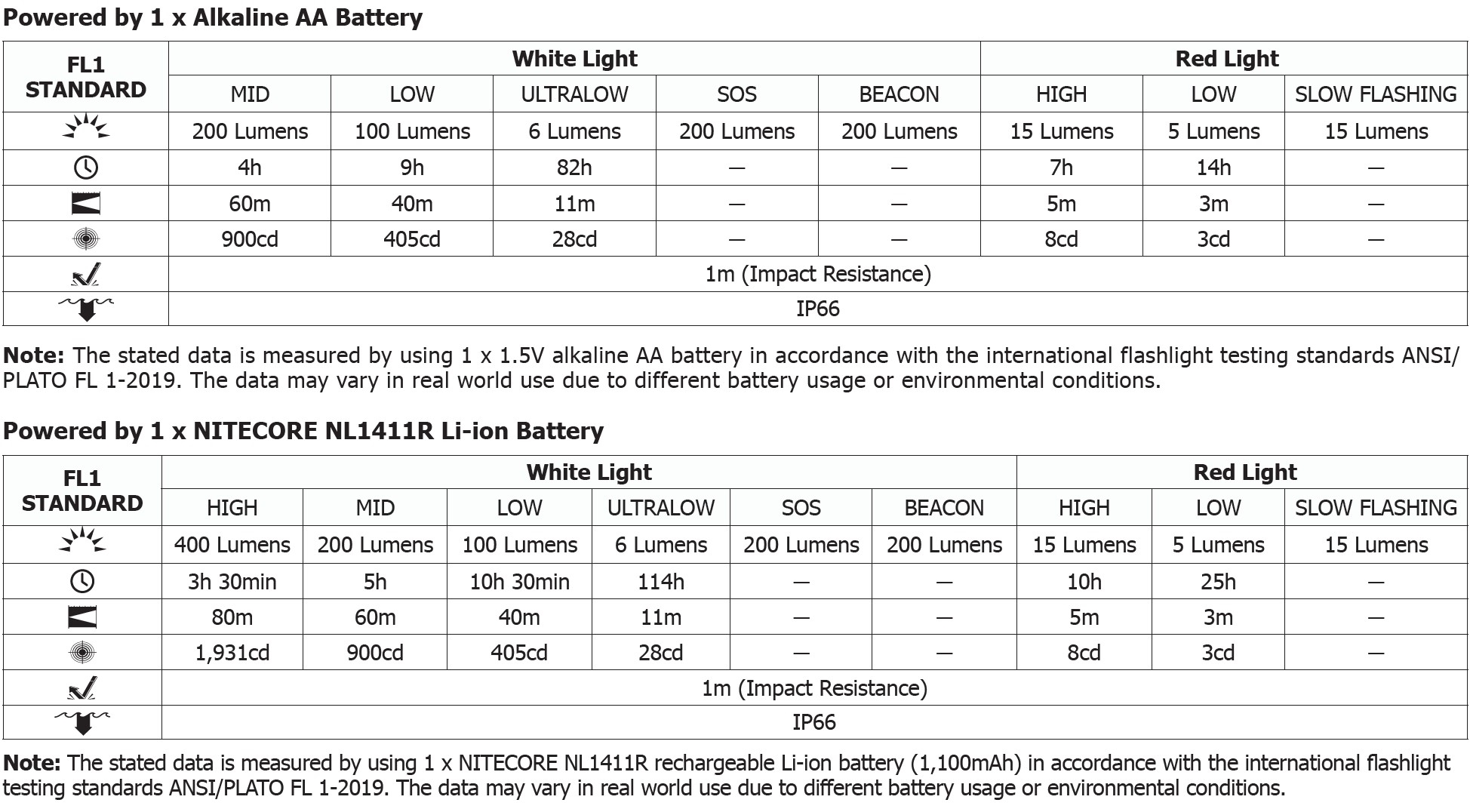 Drifttid vid högsta ljusstyrka (vit/400 lumen) NL1411R: 3 timmar och 30 min