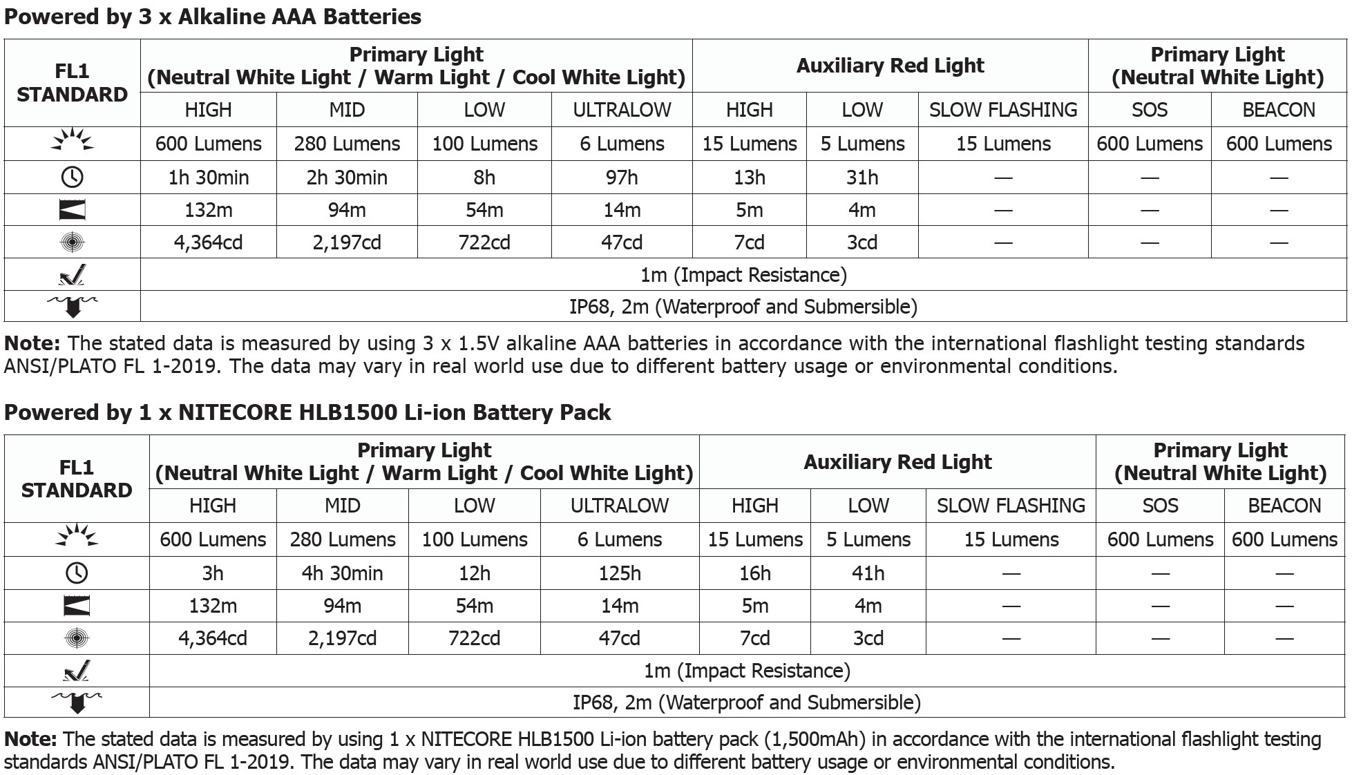 Drifttid vid högsta ljusstyrka (Vit/600 lumen) AAA : 1 timme och 30 min