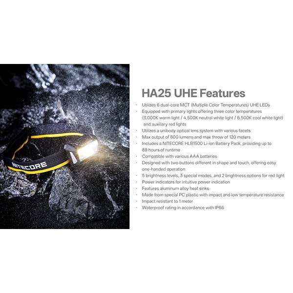 Nitecore HA25 UHE är en mångsidig och tekniskt avancerad pannlampa, designad för outdoor, löpning, vandring, arbete och vardagsbruk. Med en maximal ljusstyrka på 800 lumen och en räckvidd på upp till 120 meter får du kraftigt och precist ljus när det behövs.