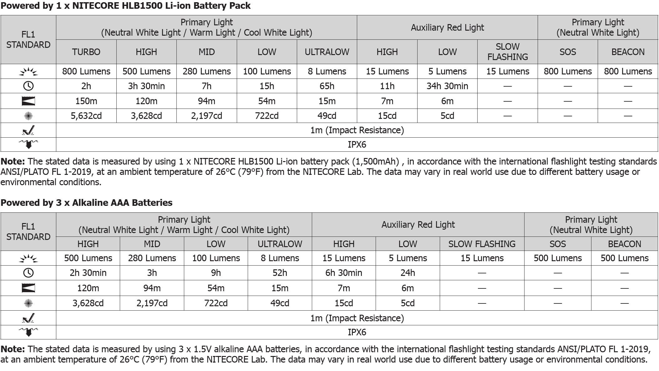 Drifttid vid högsta ljusstyrka (Vit/800 lumen) HLB1500 : 2 timmar