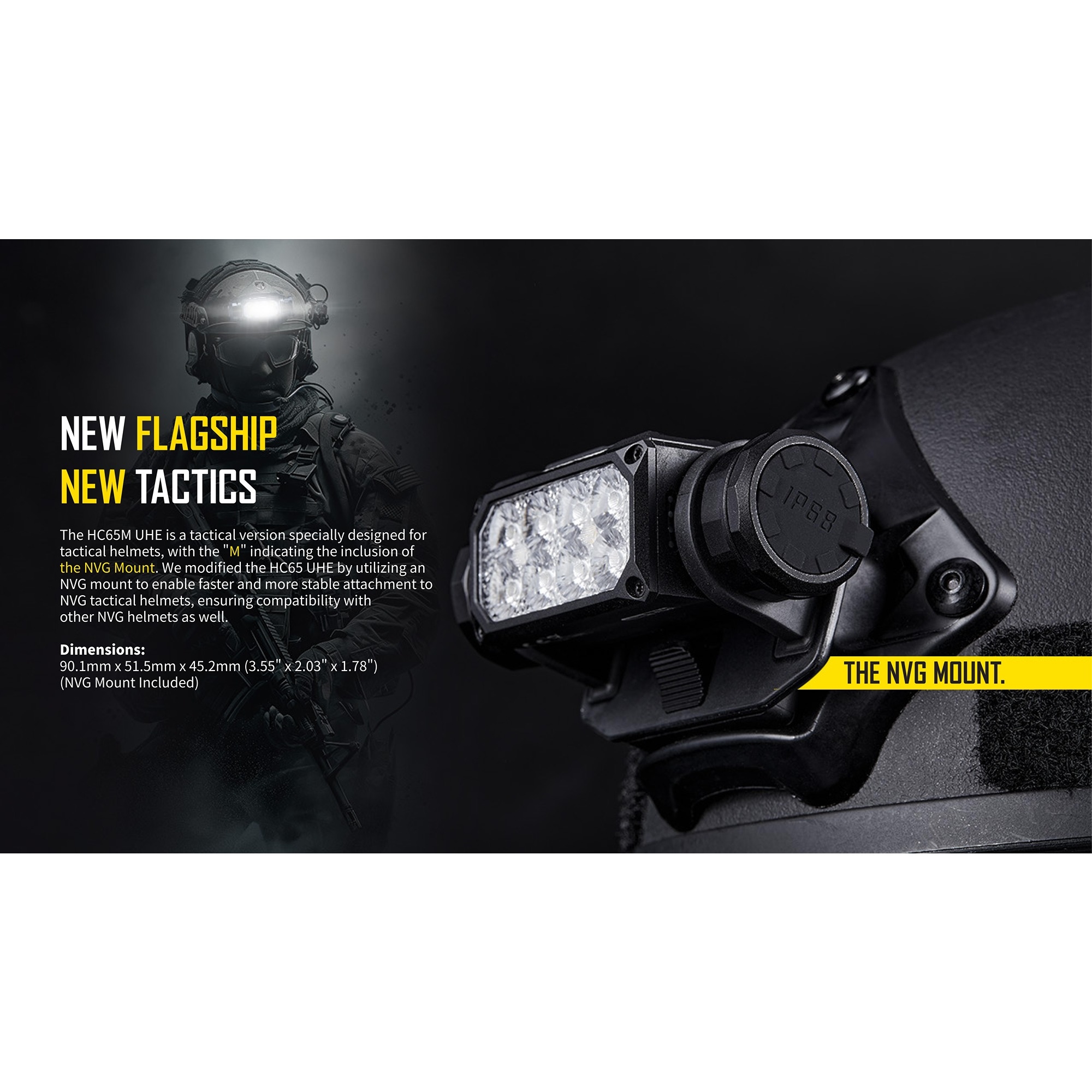 Nitecore HC65M UHE är en specialutvecklad pannlampa som är designad för montering på hjälmar med NVG-fäste, vilket gör den särskilt lämplig för taktisk användning, professionellt arbete, eftersök och krävande outdoor-aktiviteter. Den medföljande NVG-kompatibla hållaren gör att lampan sitter stabilt och säkert.
