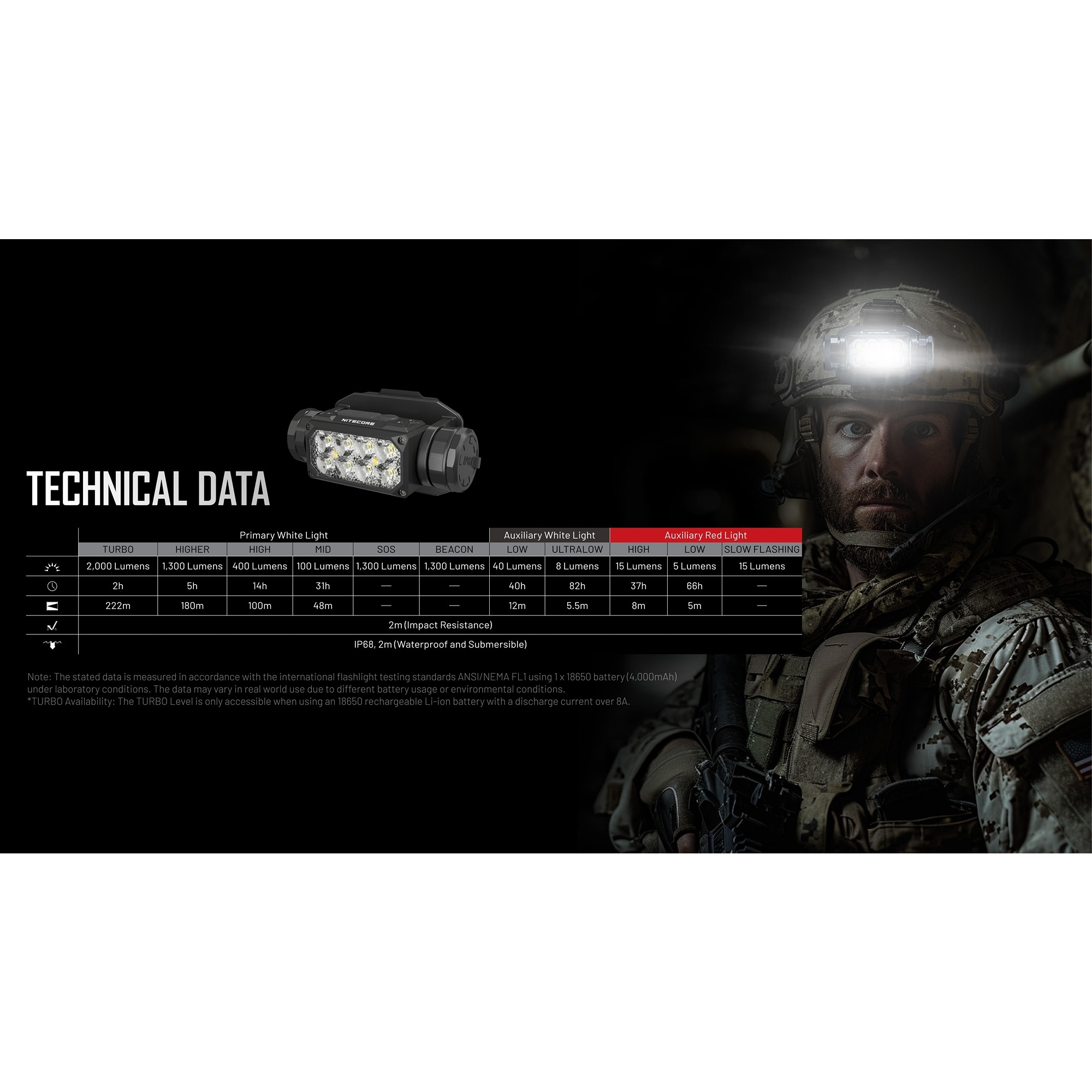 • 2000 lumen och 222 meters räckvidd ger kraftfull belysning när du behöver överblick och distans.