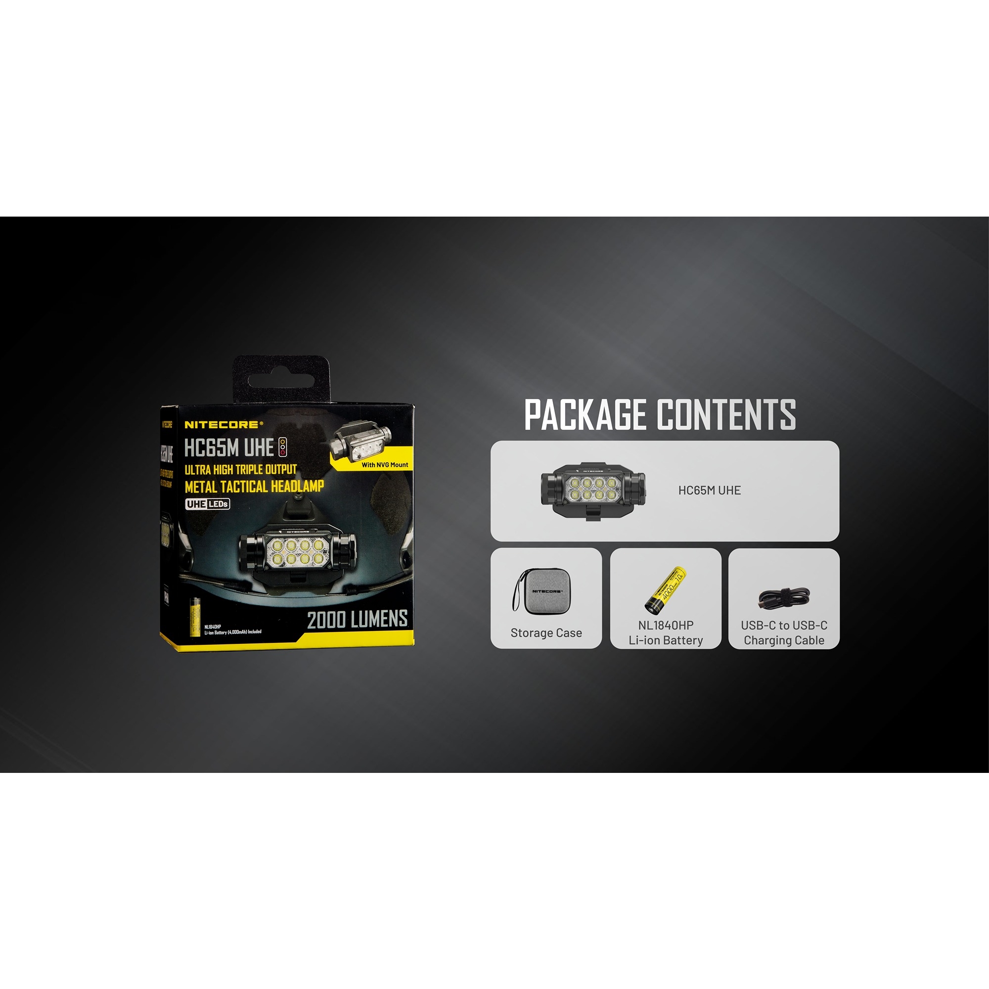 Tillbehör som medföljer: USB-C till USB-C laddkabel, förvaringsetui, NVG-fäste, NL1840HP uppladdningsbart batteri