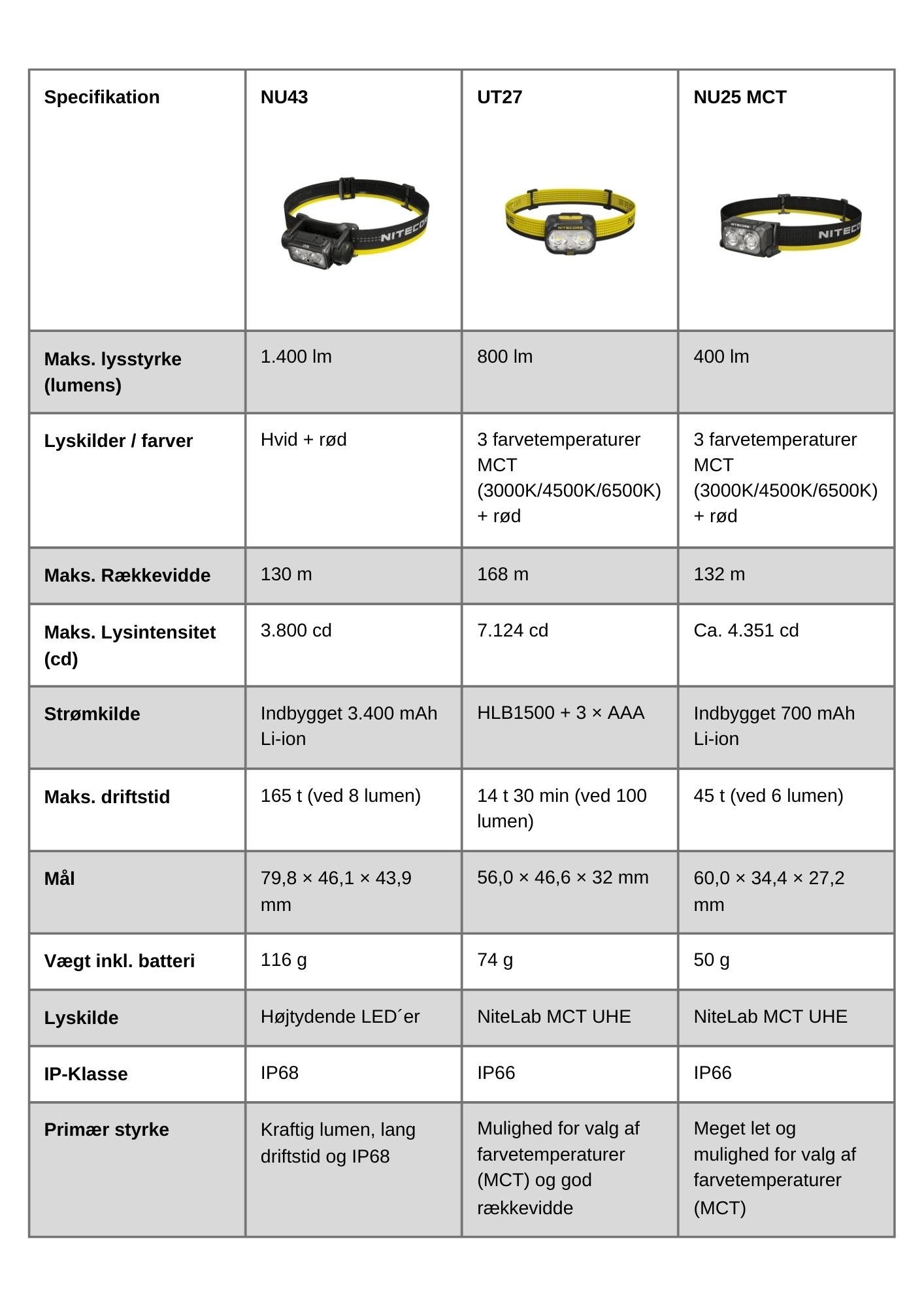 Om du är osäker på skillnaderna mellan modellerna kan du med fördel ta en titt på vårt jämförelseschema nedan, där du snabbt kan jämföra lumen, räckvidd, batterityp, vikt och IP-klassning. Det ger en tydlig överblick över vilken modell som bäst matchar dina behov.
