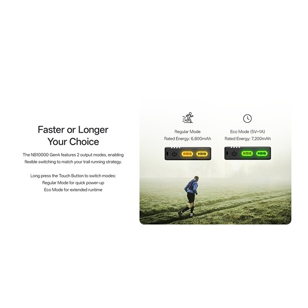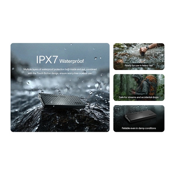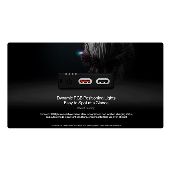 Via på/av-touchknappen kan du växla mellan Regular Mode för snabb laddning och Eco Mode, som ger långsammare laddning och längre drifttid. Powerbanken stöder därmed både effektiv snabbladdning och energibesparande laddning. Dessutom kan intelligenta funktioner som RGB-ljus vid USB-C-portarna och “Knock to Wake” aktiveras, vilket gör det enkelt att hantera powerbanken i mörka eller kalla förhållanden – även med handskar på – genom att lätt knacka på toppen för att se portarna och strömindikationen.