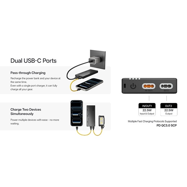Powerbanken är utrustad med två USB-C-portar, varav den ena fungerar som både in- och utgång, medan den andra är dedikerad utgång. Detta gör det möjligt att använda powerbanken för samtidig laddning av två enheter eller som pass-through-laddning, där både powerbank och enhet laddas samtidigt – perfekt när du bara har tillgång till ett uttag. NB10000 Gen4 levereras med en USB-C till USB-C-kabel, som är integrerad som lanyard och alltid redo för användning.