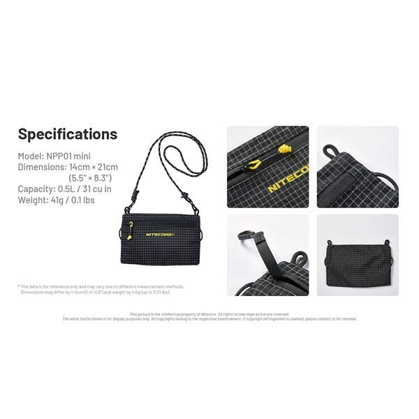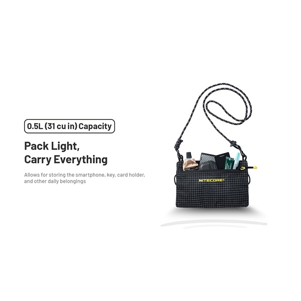 Nitecore NPP01 Mini är en kompakt och praktisk axelväska designad för både vardag och outdoor. Med en vikt på endast 41 g och en kapacitet på 0,5 liter ger den plats för smartphone, nycklar, kort eller andra småsaker du behöver ha nära till hands.