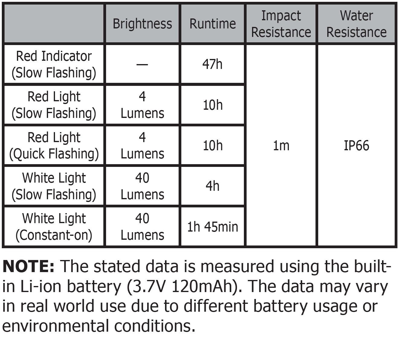 • Upp till 40 lumen röd/vit LED för effektiv synlighet i trafiken