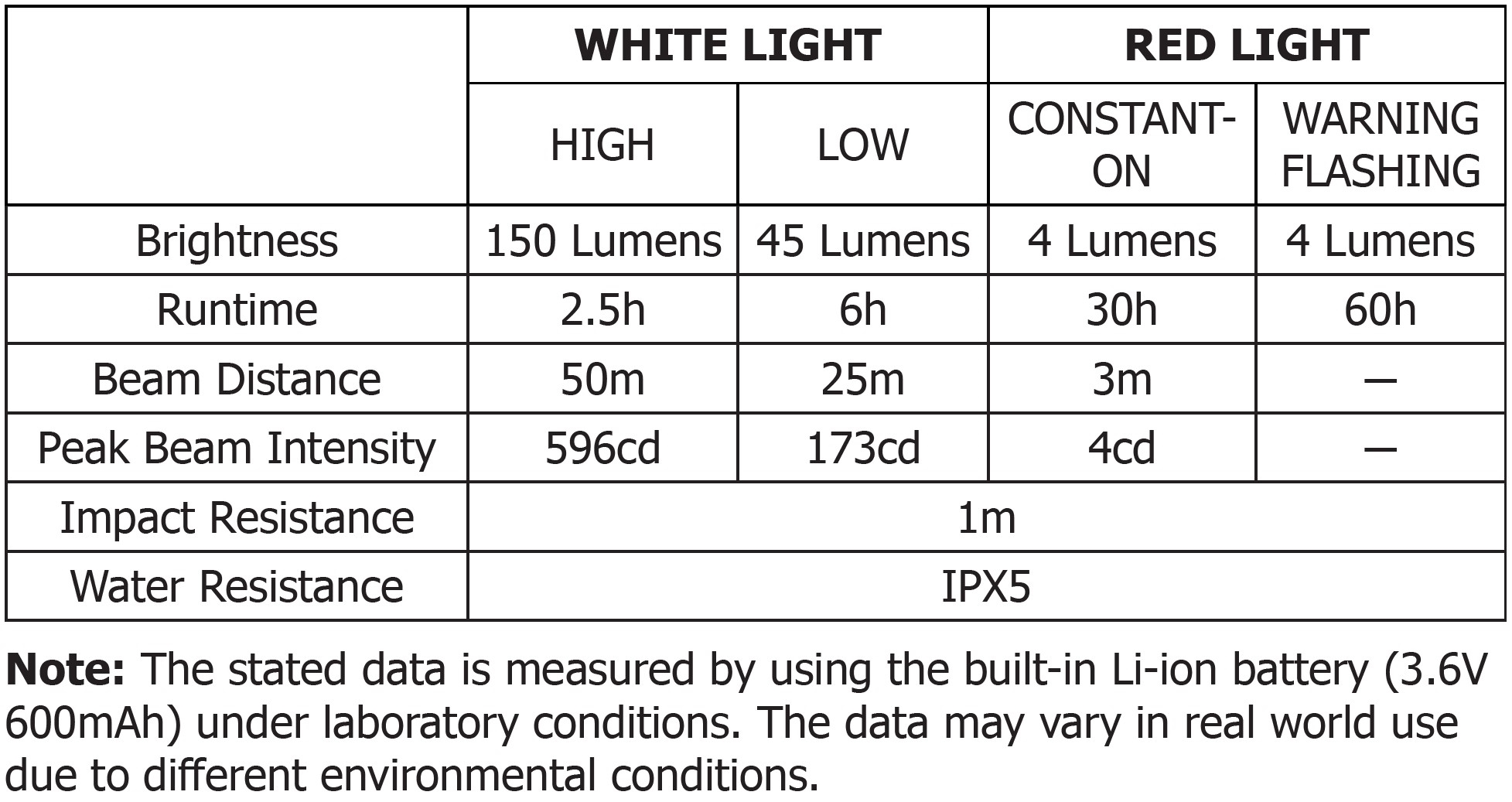 Drifttid vid högsta ljusstyrka (vit/150 lumen): 2 timmar 30 min