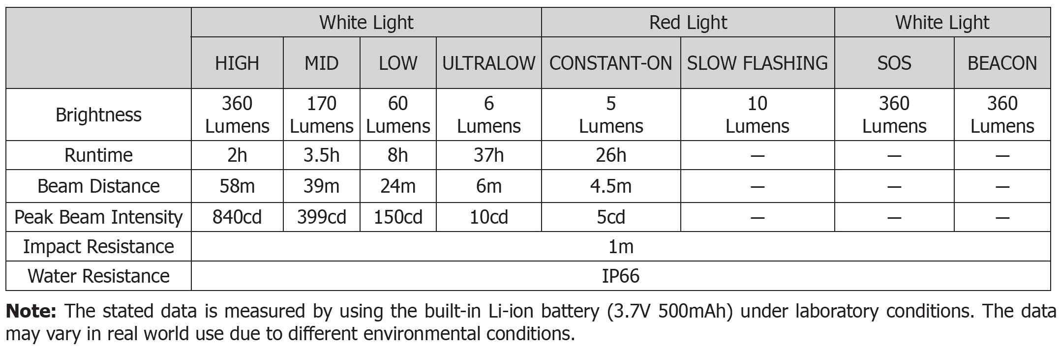Drifttid vid lägsta ljusstyrka (Vit/6 lumen): 37 timmar