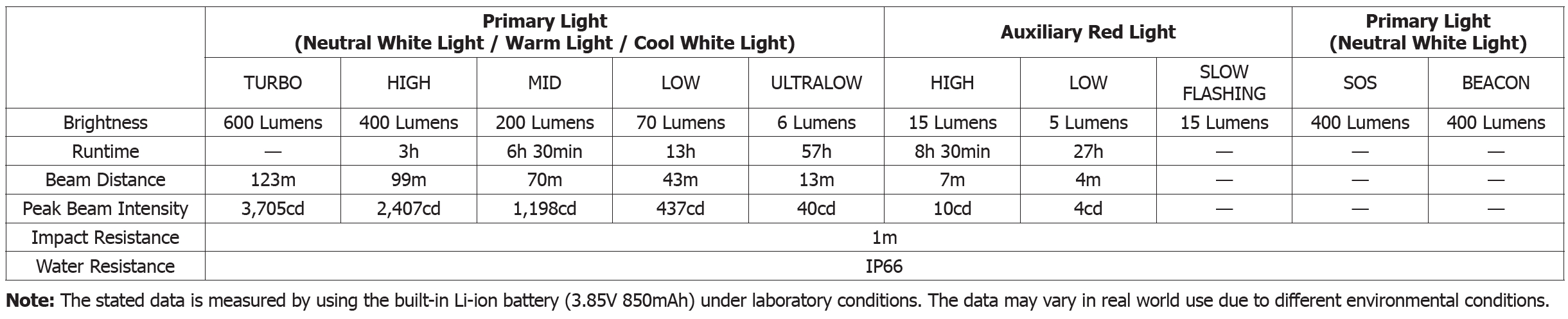 Drifttid vid högsta ljusstyrka (Vit/400 lumen) : 3 timmar