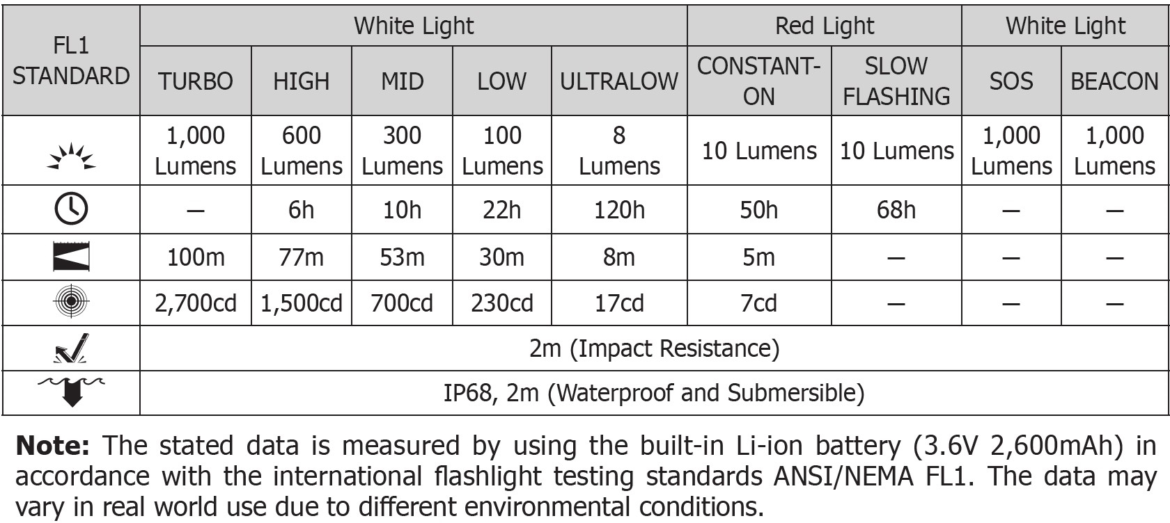 Drifttid vid lägsta ljusstyrka (Vit/8 lumen): 120 timmar