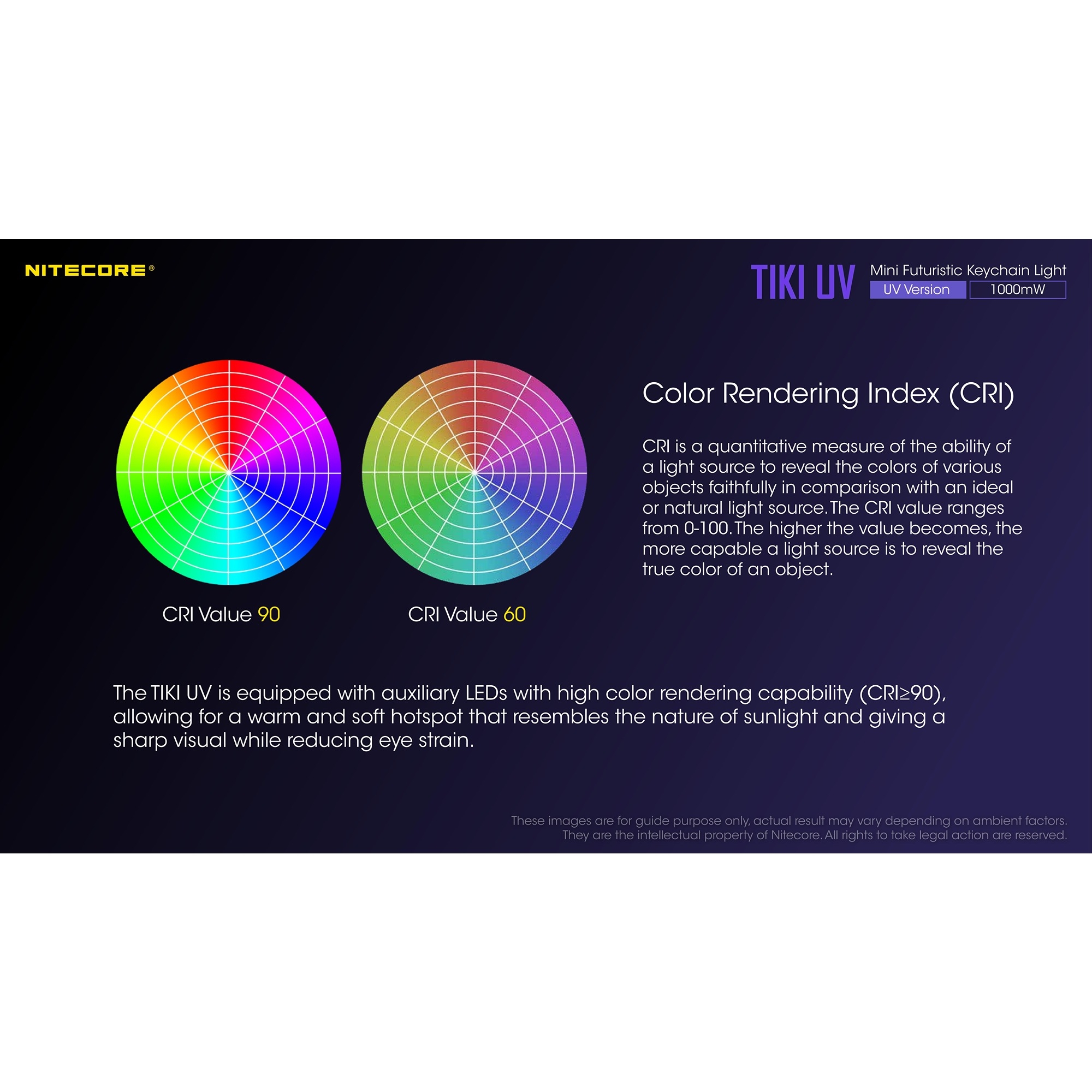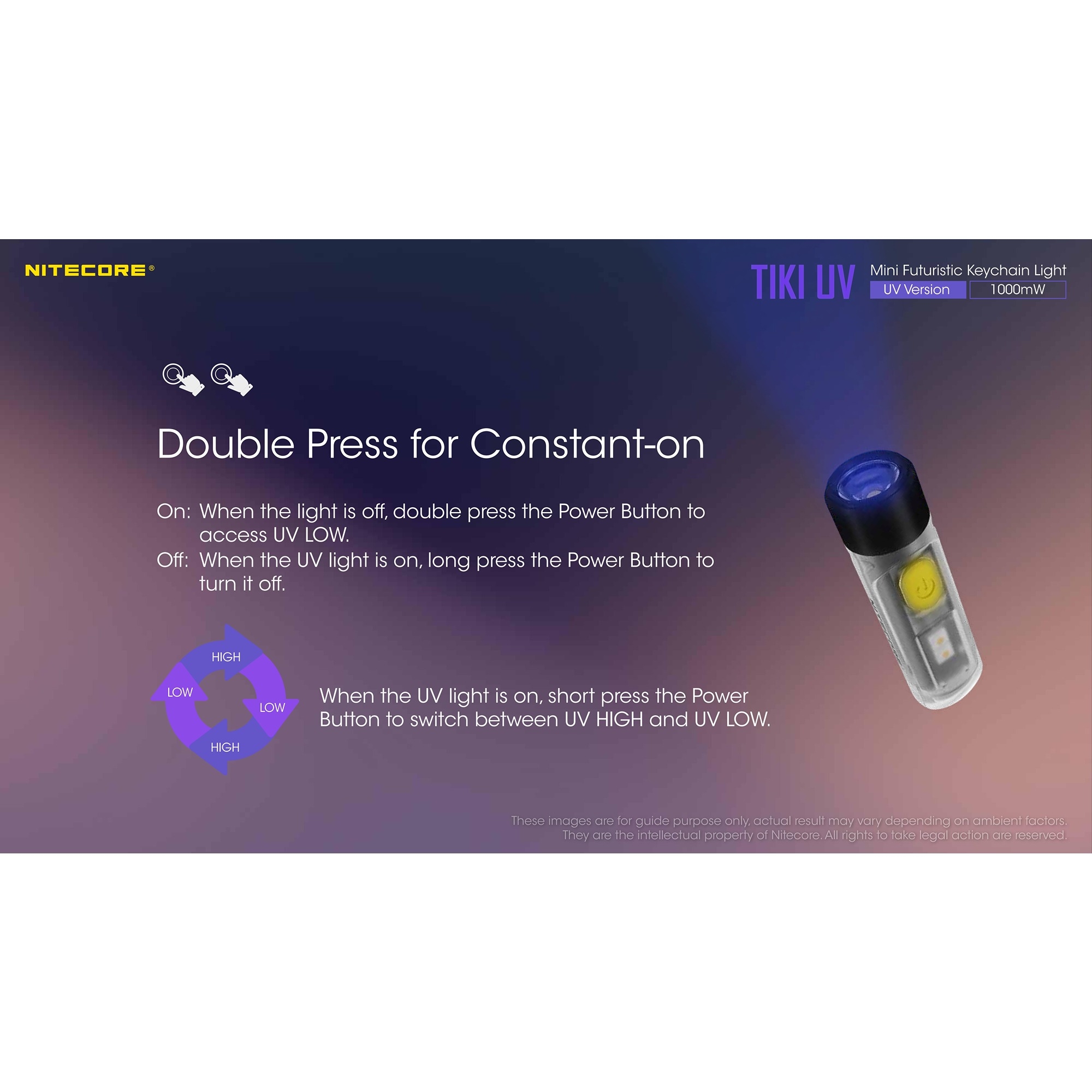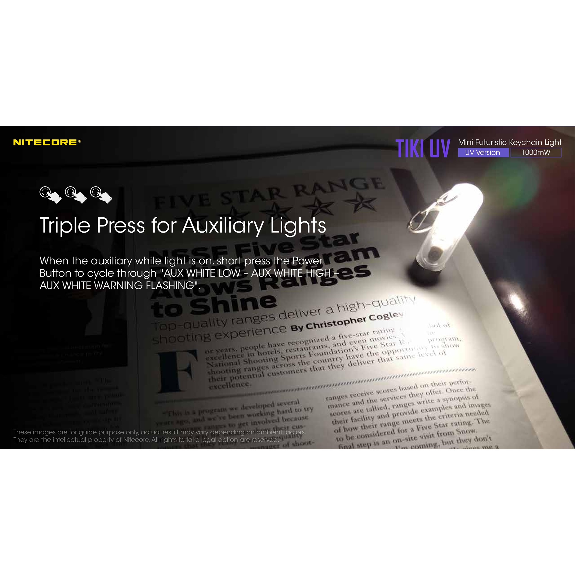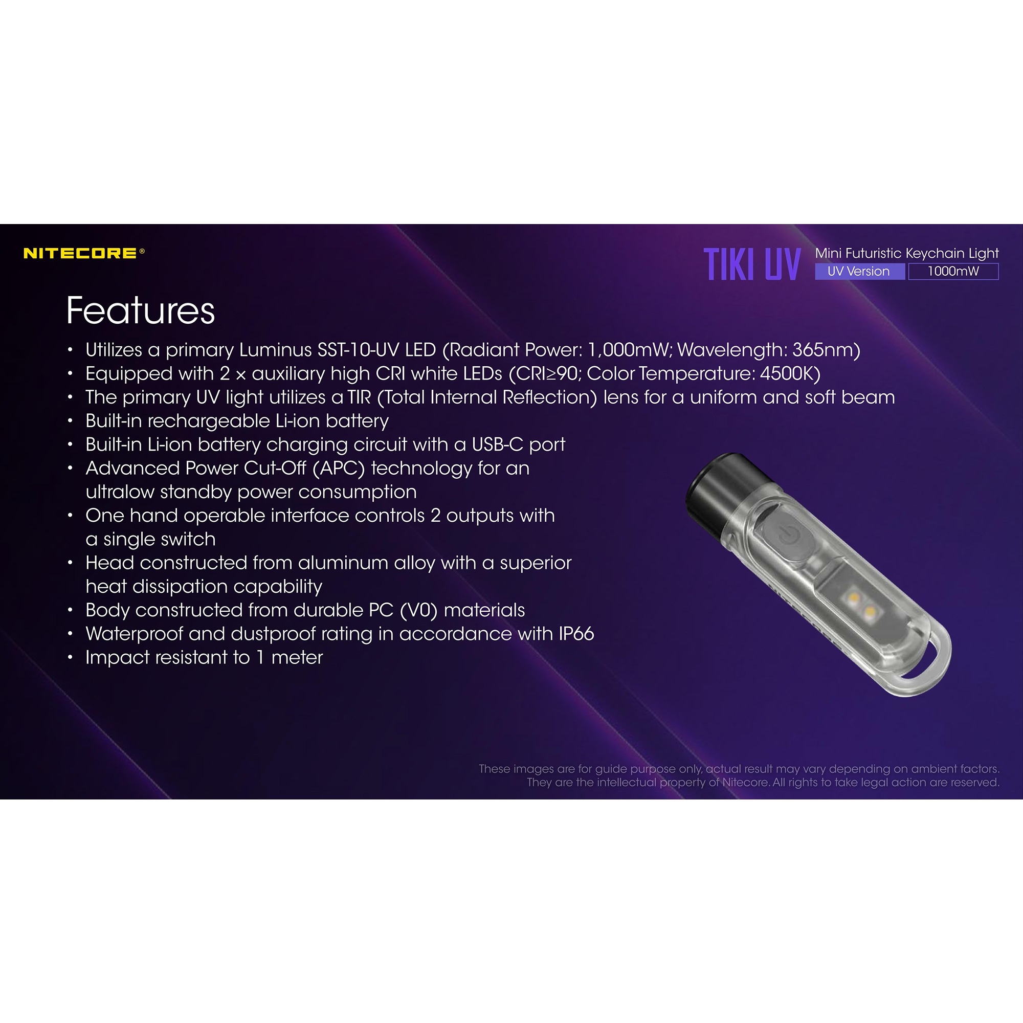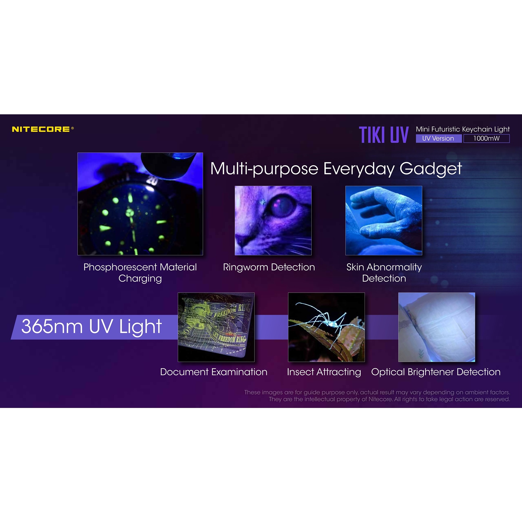 Lampan kombinerar vitt ljus på upp till 70 lumen med UV-ljus vid 365 nm och en UV-effekt på upp till 1000 mW. Det gör Nitecore TIKI UV lämplig för allt från att hitta småsaker i mörker och orientera sig på nära håll till kontrolluppgifter där ultraviolett ljus kan vara en fördel. Den vita ljuskällan har en räckvidd på upp till 12 meter, vilket passar bra för nära uppgifter, nödsituationer och daglig användning.