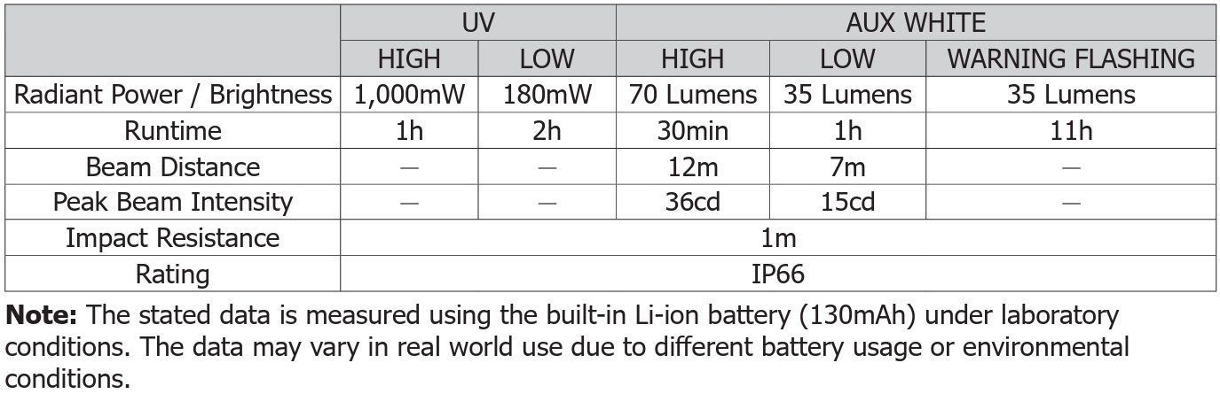 • Kombinerar vitt LED-ljus och 365 nm UV-ljus i en mycket kompakt nyckelringslampa.