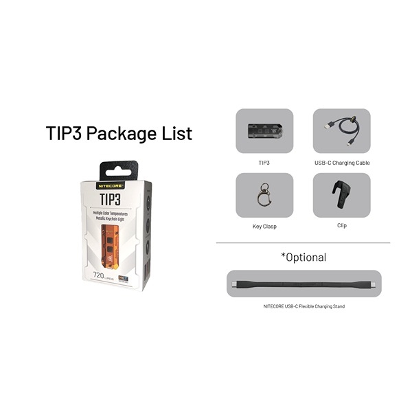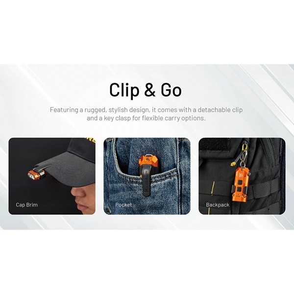 TIP3 levereras med clip och nyckelring, så den enkelt kan bäras på kepsen, i fickan, på ryggsäcken eller på nyckelringen. En flexibel lösning som säkerställer att din nyckelringslampa alltid är nära till hands.
