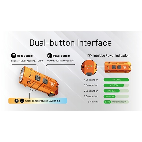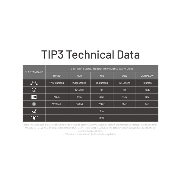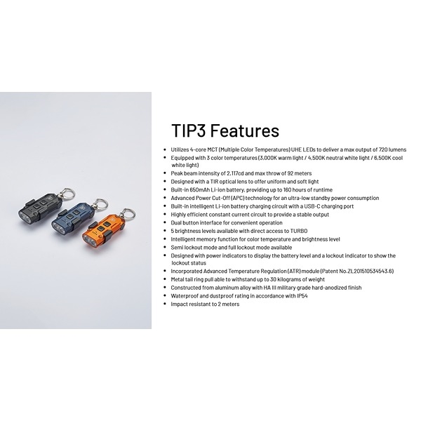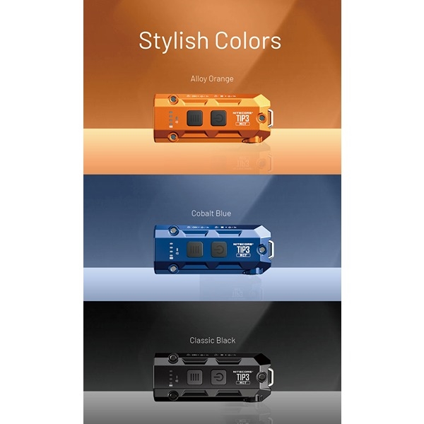 NITECORE TIP3 är en kompakt och kraftfull EDC- och nyckelringslampa som kombinerar hög prestanda med minimal storlek. Perfekt för nyckelringen, fickan eller som backup-lampa för vardagen, utomhusaktiviteter, löpning och arbete. Lampan är designad med den unika MCT-teknologin, vilket ger tre färgtemperaturer (CRI): Neutralt vitt ljus 4500K, kallt vitt ljus 6500K och varmt vitt ljus 3000K, så du alltid kan välja det ljus som passar bäst för miljön. Läs och förstå mer om den smarta MCT-teknologin här. Här kan du välja mellan fem olika ljusstyrkor per färgtemperatur, från TURBO till ultralåg på 1 lumen med upp till 160 timmars drift