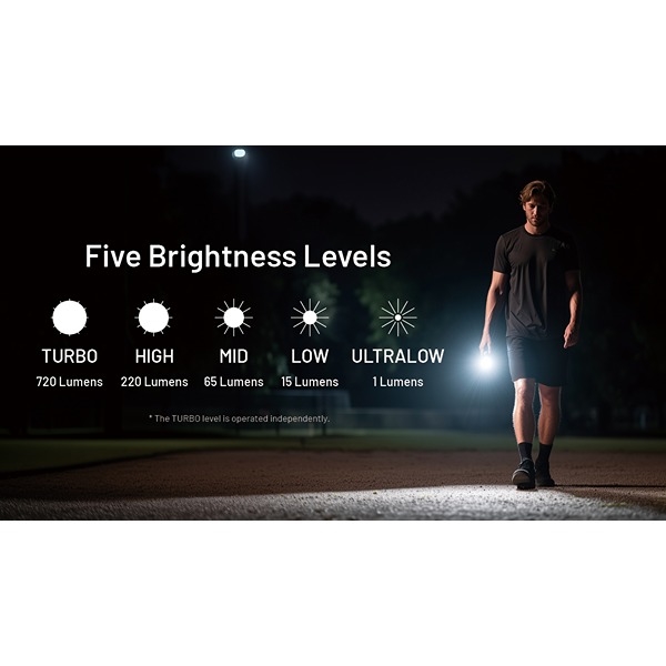 Varmt vitt ljus (3000K) - Turbo: 720 lumen | Hög: 220 lumen | Medel: 65 lumen | Låg: 15 lumen | Ultralåg: 1 lumen