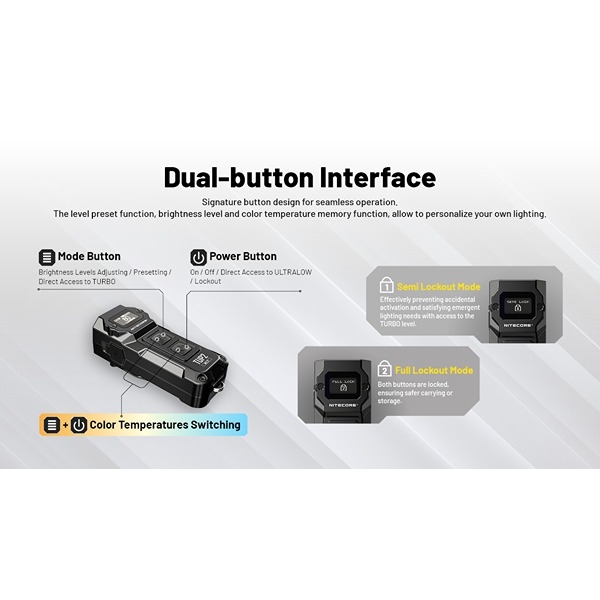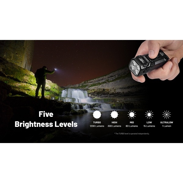 Lampan har fem ljusstyrkenivåer (från 1 till 1200 lumen), genväg till TURBO- och ULTRALOW-läge samt en dubbelknapps kontroll som gör det enkelt att byta ljusstyrka och färgtemperatur. Den integrerade OLED-displayen visar i realtid batteristatus, återstående driftstid, ljusstyrka och färgtemperatur.