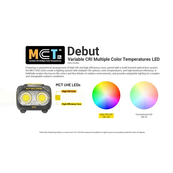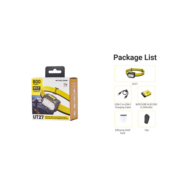Pannlampan är utrustad med MCT UHE LED-teknologi, ett rött hjälpljus för nattsyn och dubbla strömknappar för snabb och intuitiv användning. Den väger endast 74 g, har IP66-skydd, ett 90° justerbart fäste och ett självlysande batterirum som gör batteribyten enkla i mörker. UT27 levereras med ett reflekterande, andningsbart pannband, multifunktionsklämma och diffuserpåse – redo för alla friluftsäventyr.