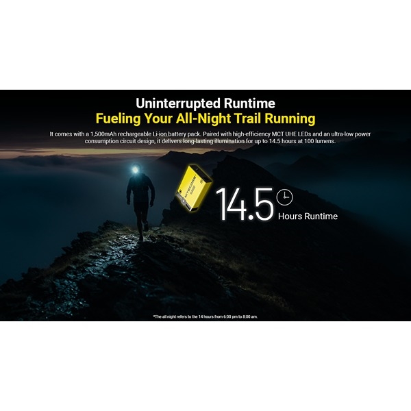 Max. drifttid: 14 timmar och 30 min (100 lumen) med HLB1500