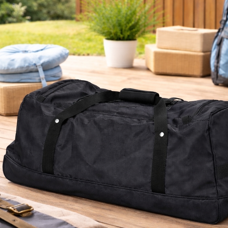 Väskan har svart dragkedja, elastiskt snöre upptill för att fästa en filt eller kudde under och 2 praktiska mesh-sidfickor för t.ex. vattenflaskan. När den inte används kan resväskan enkelt rullas ihop för platsbesparande förvaring, eller tas med som en extra väska i resväskan. En mångsidig, lätt och funktionell resväska för både weekendresor och långa resor.