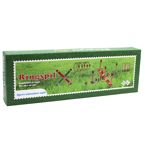 Detta klassiska ringkast i trä är ett underhållande trädgårdsspel för både barn och vuxna. Spelet mäter 40 x 40 x 6,5 cm och levereras med 5 rejäla rep-ringar. Den robusta träkonstruktionen i röd och grön ger ett klassiskt utseende och säkerställer stabilitet under spelet.