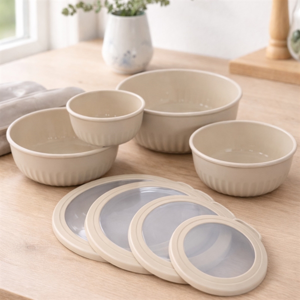 De beige skålarna och locken tål diskmaskin, mikrovågsugn och är fryssäkra, vilket gör dem perfekta för både vardag och matförberedelser. Det slitstarka plastmaterialet är lätt, hållbart och enkelt att rengöra, medan den moderna beige looken passar in i alla kök.
