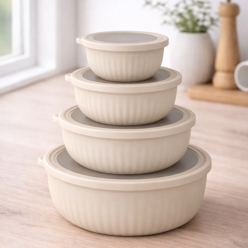 Beige stapelbart skålset med lock – 4 runda plastskålar med lock
