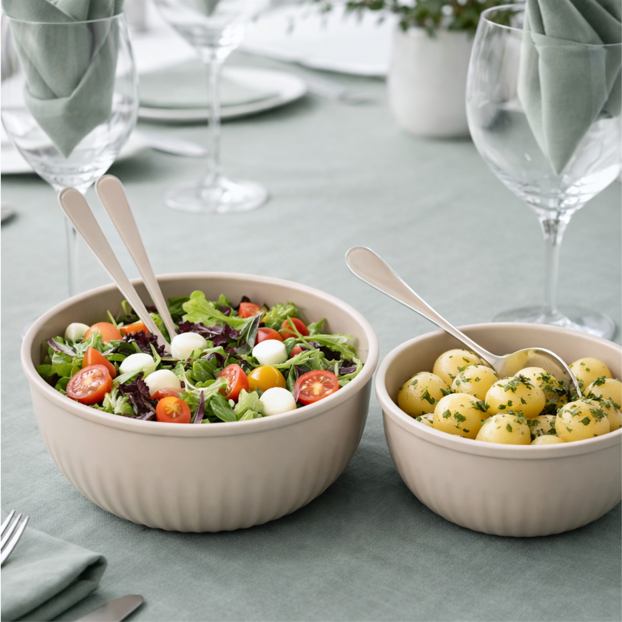 Skålarna fungerar också som fina serveringsskålar för dukningen, där den enkla beige designen skapar ett lugnt och inbjudande uttryck. När måltiden är slut är det enkelt att sätta locket direkt på skålen och ställa den i kylskåpet eller frysen. Det gör förvaring av rester snabb, hygienisk och praktisk – helt utan ompackning.