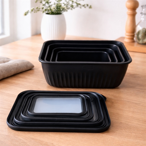 Svart stapelbart skålset med lock – 4 rektangulära plastskålar med lock