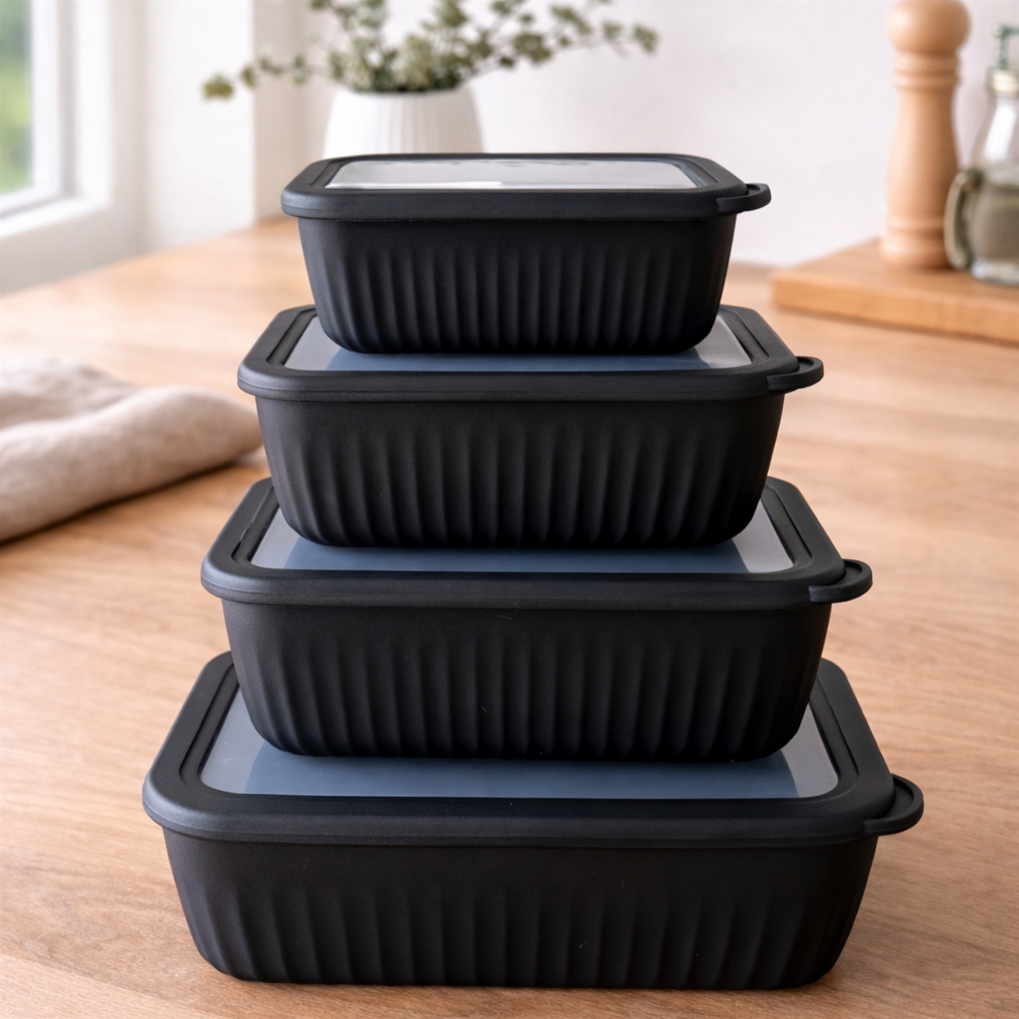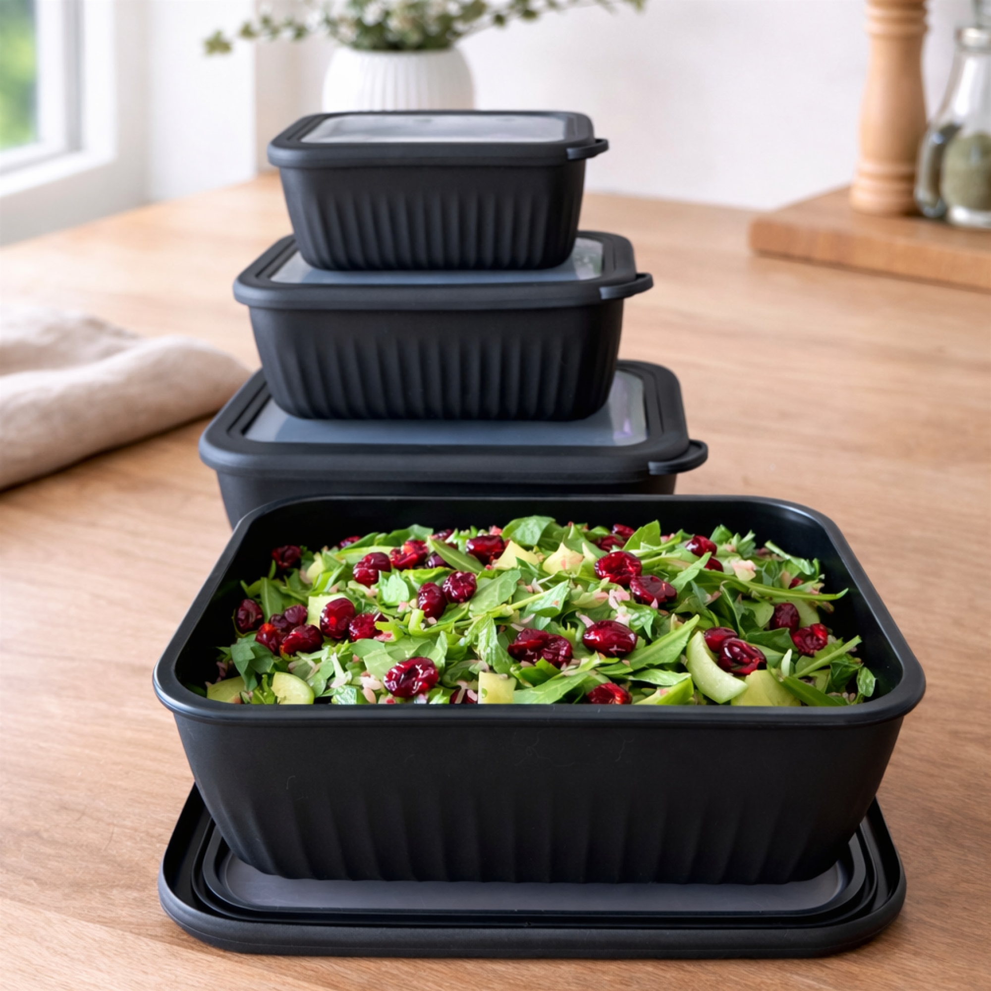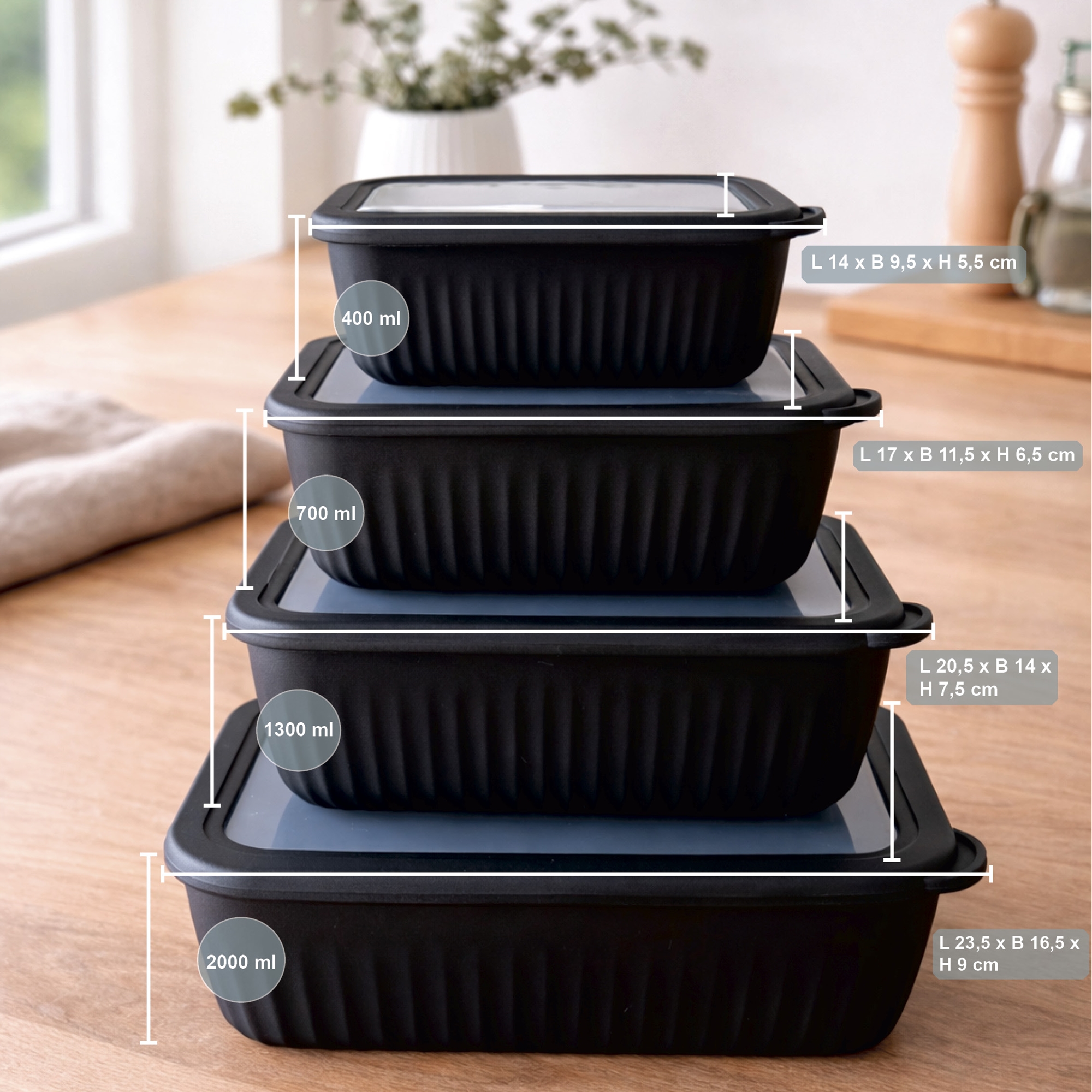 Detta eleganta svarta skålset i rektangulär form är både praktiskt och har en snygg design. Setet består av 4 plastskålar med tättslutande och transparent lock i storlekarna 400, 700, 1300 och 2000 ml – perfekta för både servering på middagsbordet och smart förvaring av livsmedel, snacks och hobbyartiklar.