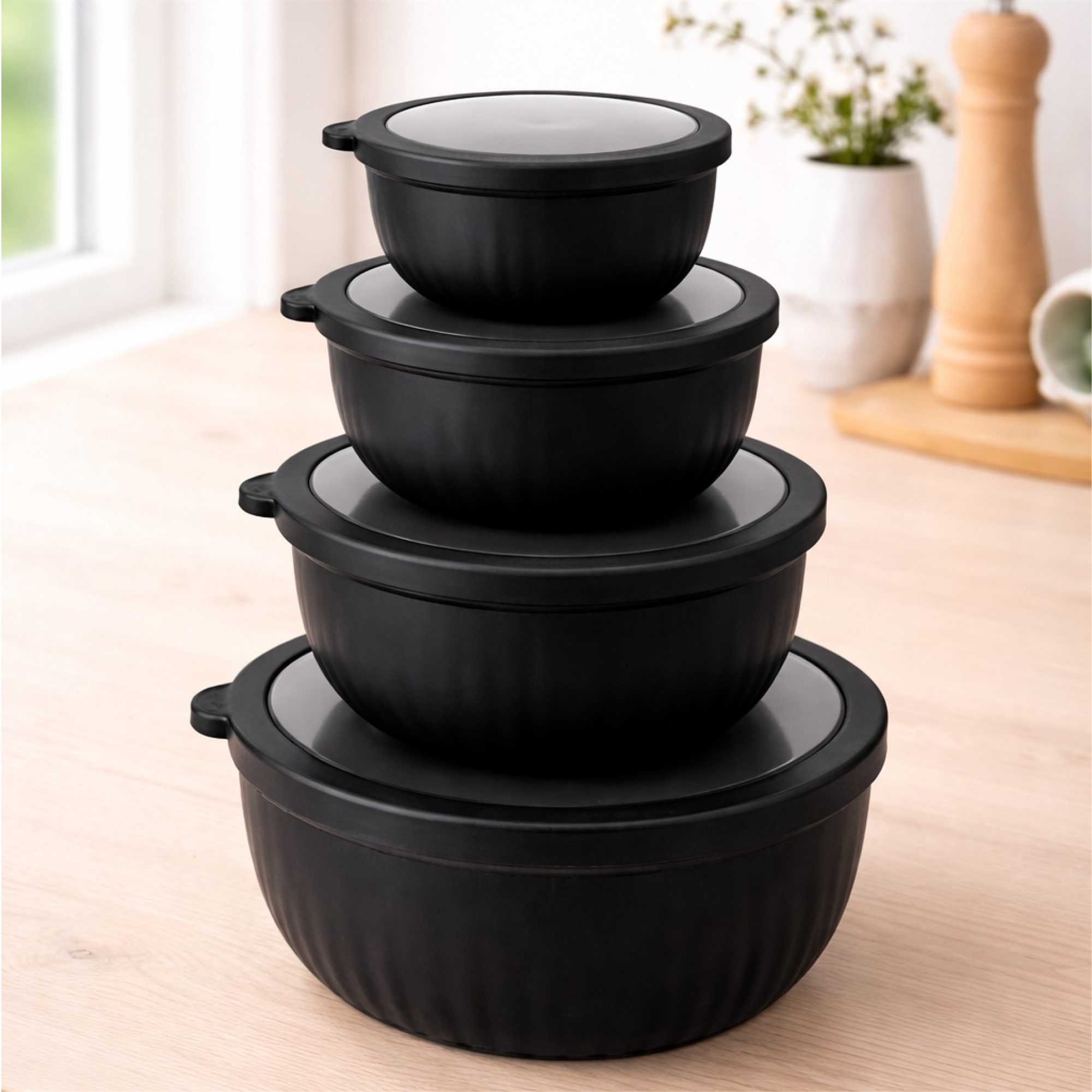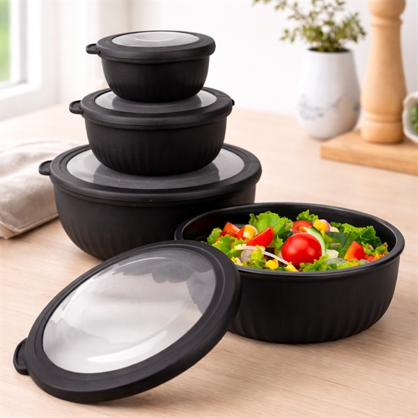 De svarta skålarna och locken tål diskmaskin, mikrovågsugn och är fryssäkra, vilket gör dem perfekta för både vardag och matförberedelser. Det slitstarka plastmaterialet är lätt, hållbart och enkelt att rengöra, medan den moderna svarta looken passar in i alla kök.