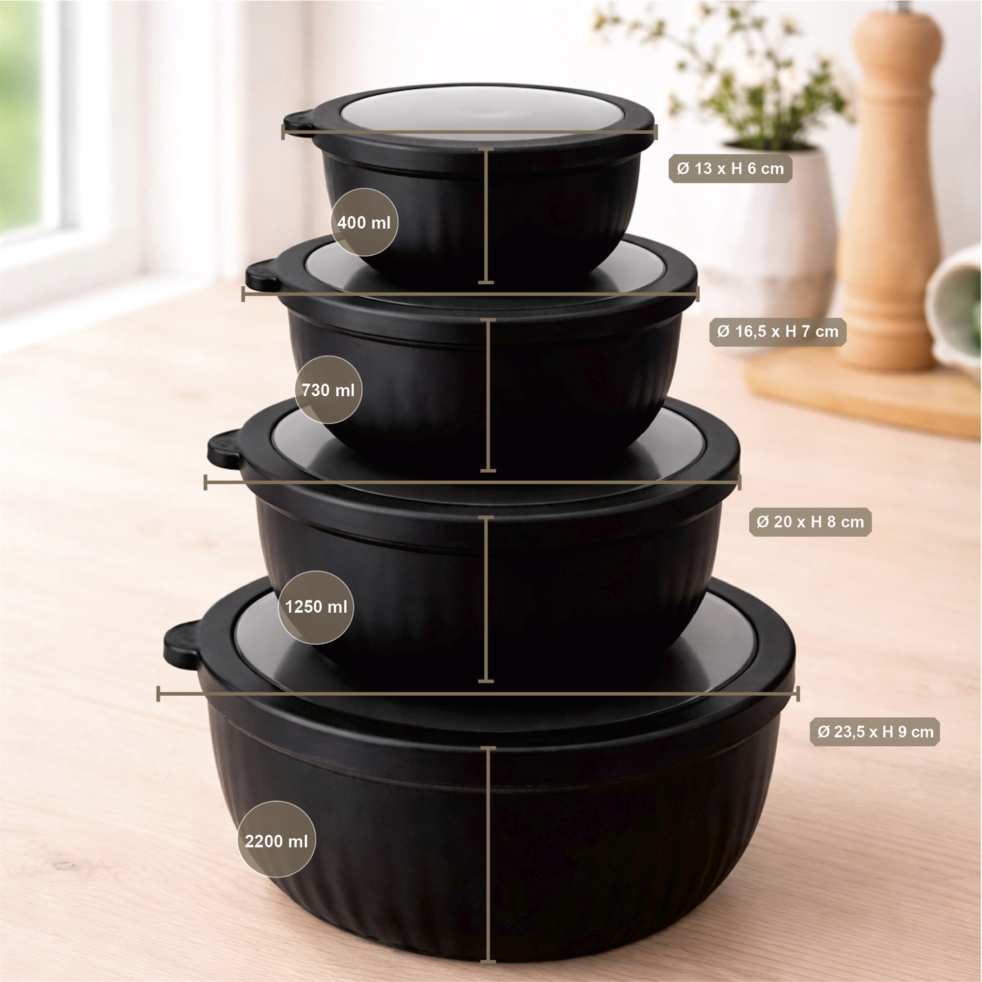 Detta eleganta svarta skålset i rund form är både praktiskt och har en snygg design. Setet består av 4 plastskålar med tättslutande och transparent lock i storlekarna 400, 730, 1250 och 2200 ml – perfekta för både servering på matbordet och smart förvaring av livsmedel, snacks och hobbyartiklar.